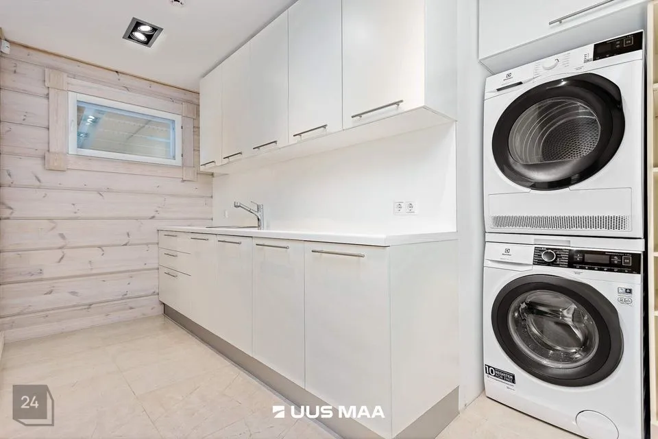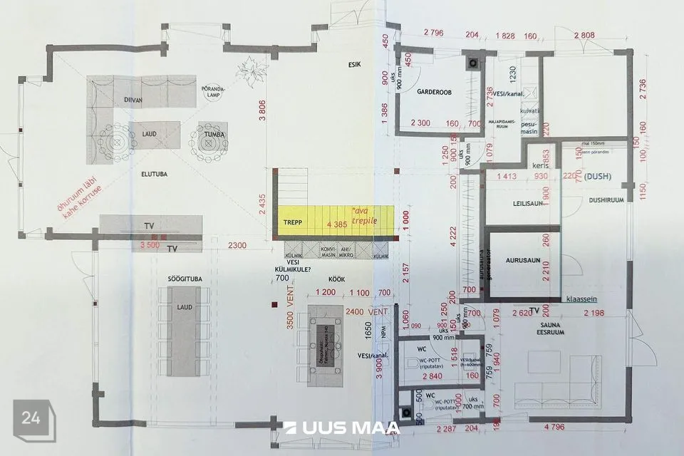On the first floor, there is a kitchen-dining area, a spacious living room from which you can access a large, sunny terrace to enjoy evening coffee. An entrance with a large wardrobe and cloakroom, a toilet, utility room, a large living room with an open kitchen (58.1 m²), a sauna, sauna anteroom, and instead of a shower, there is a spacious playroom with a toilet.