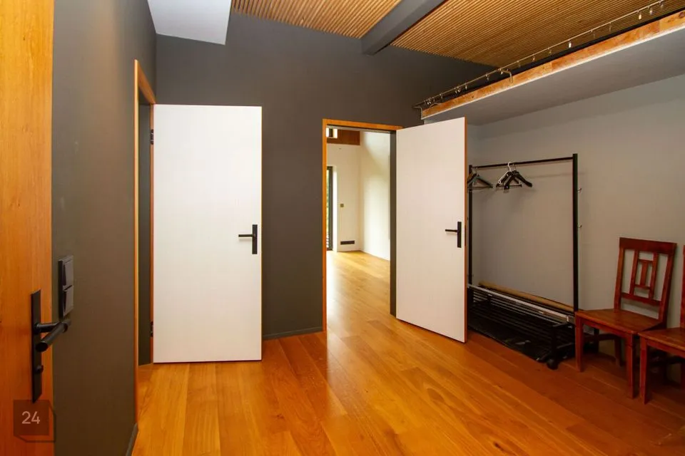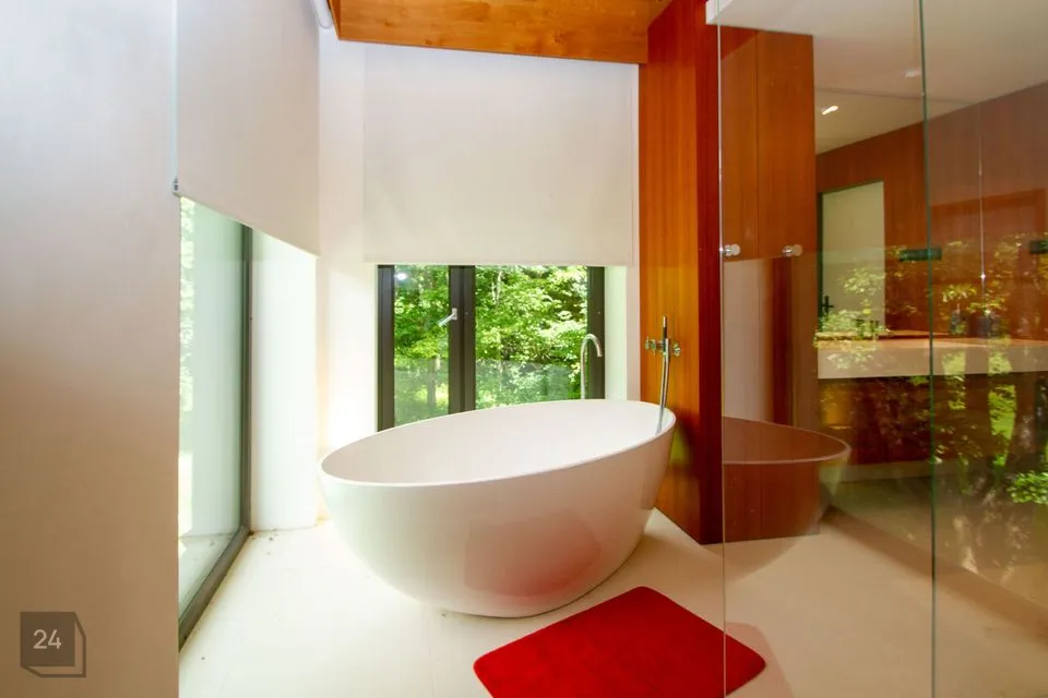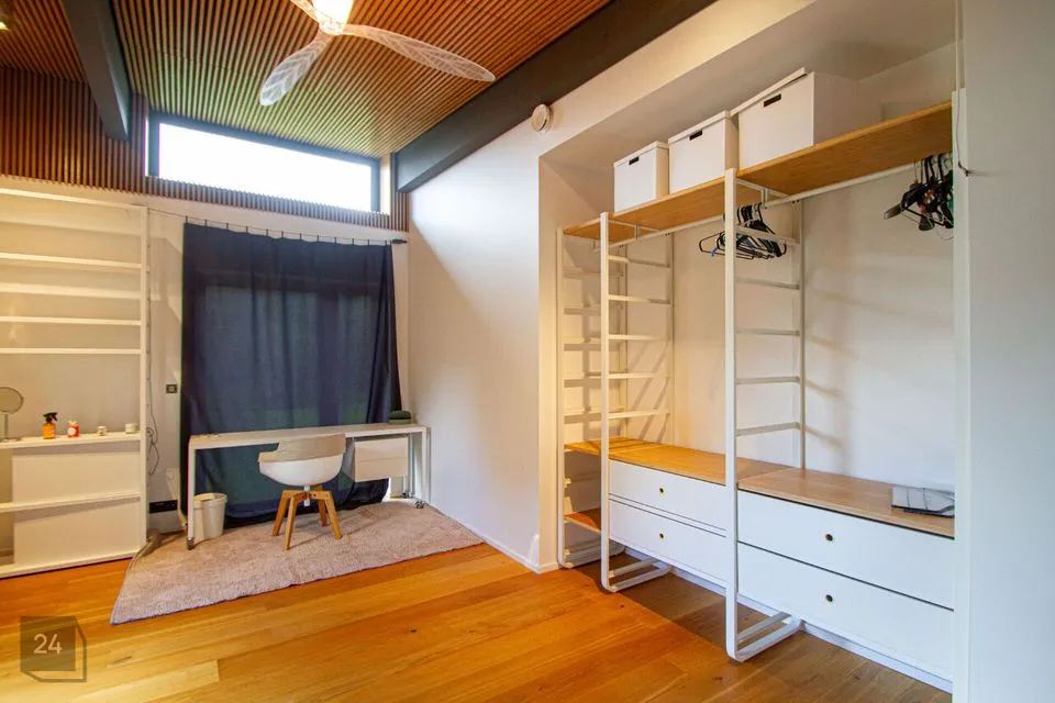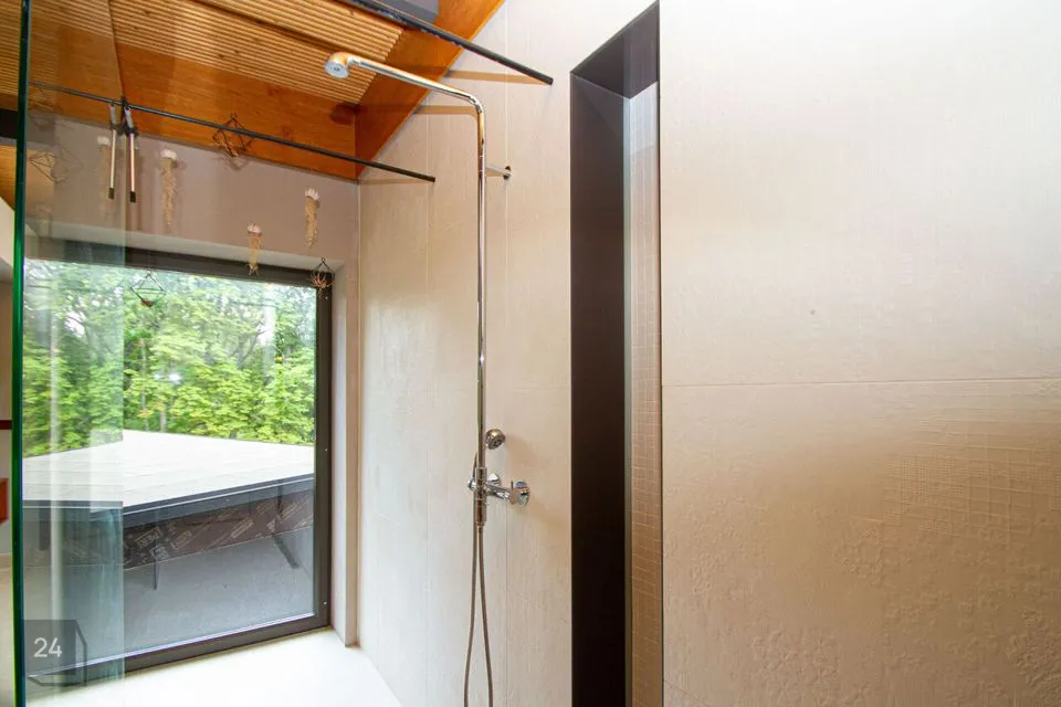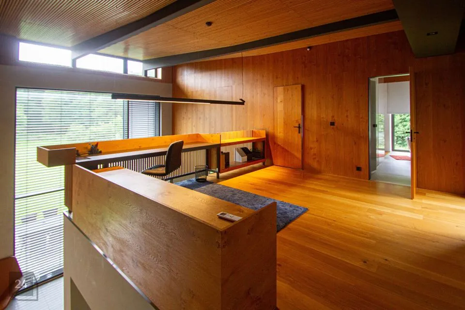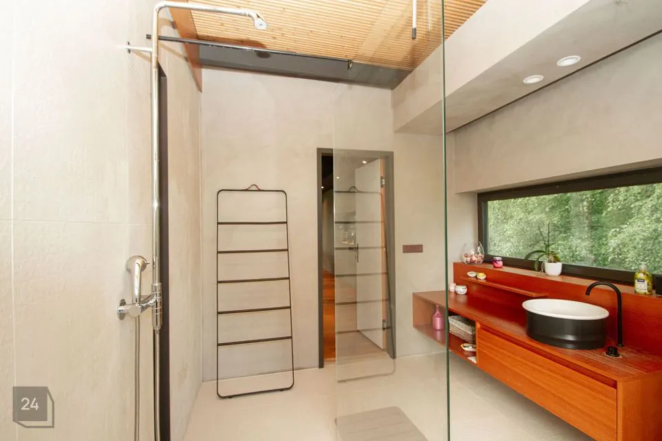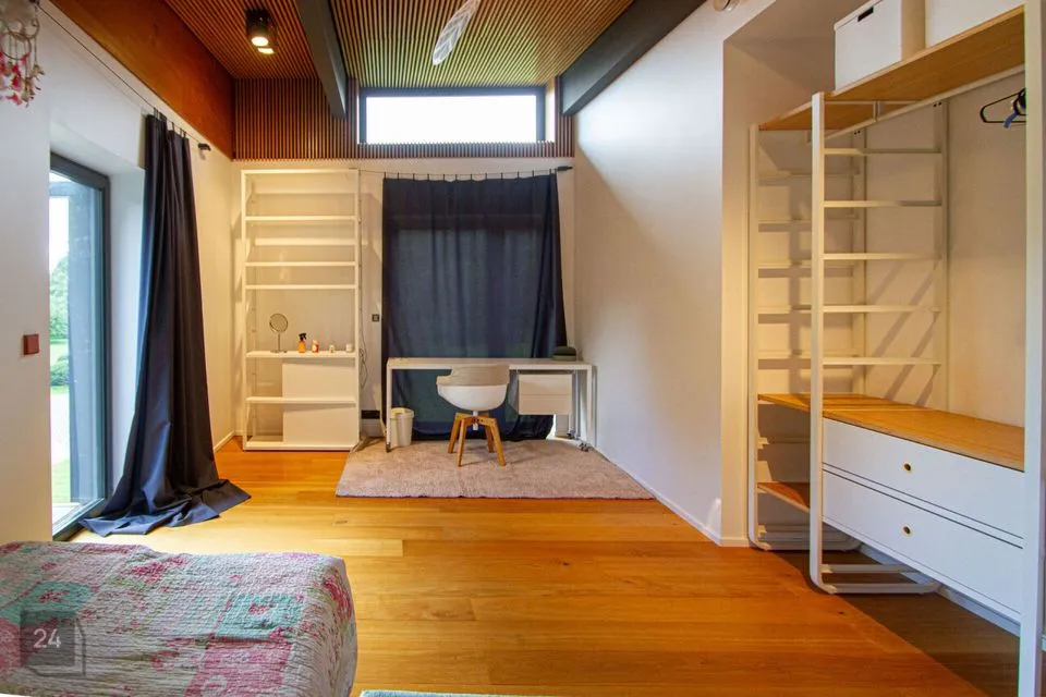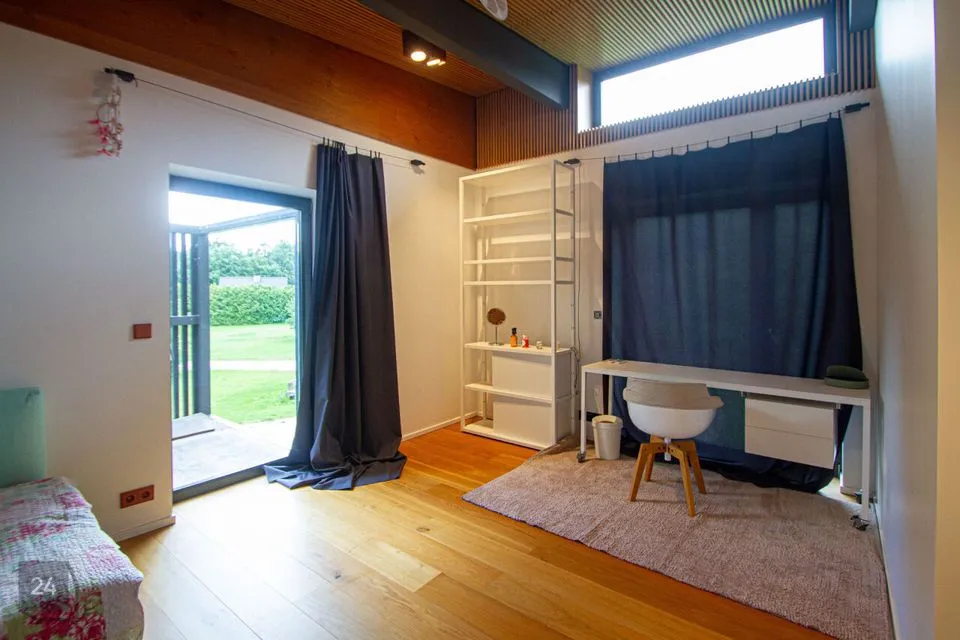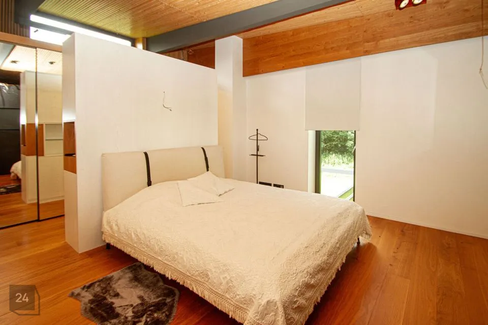 - The second section: a spacious walkthrough room that can be used as an office. Further, there is a bedroom with a spacious wardrobe, a shower room, and a cozy corner with a bathtub with a view of nature thanks to the large windows.