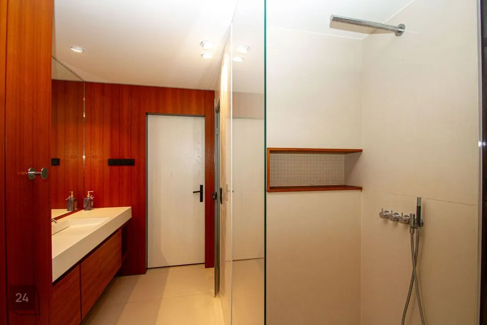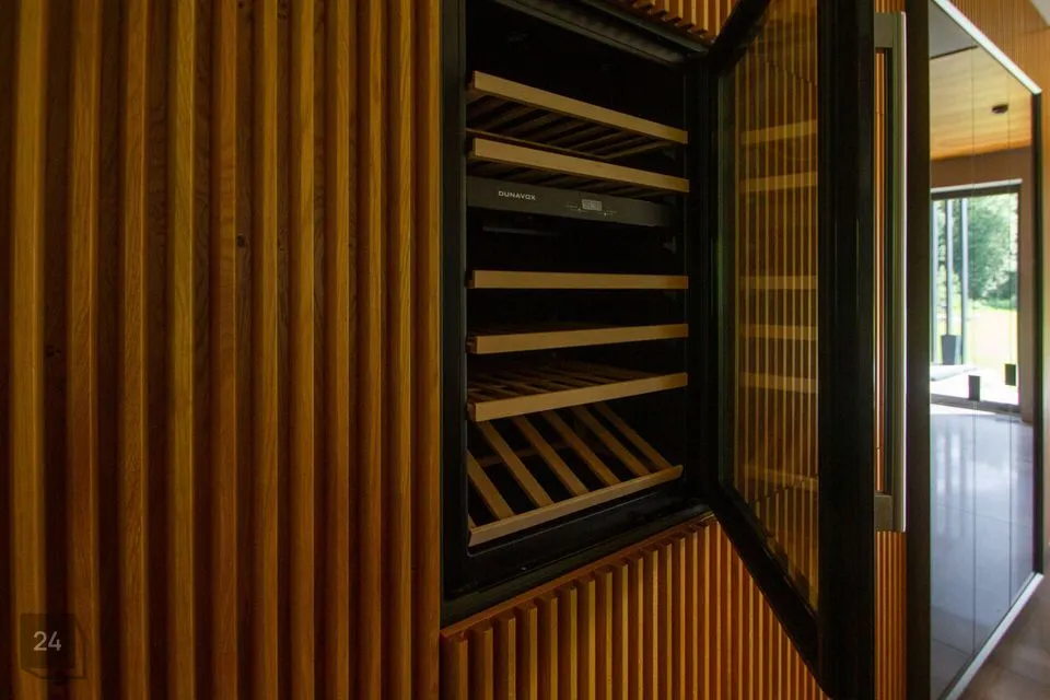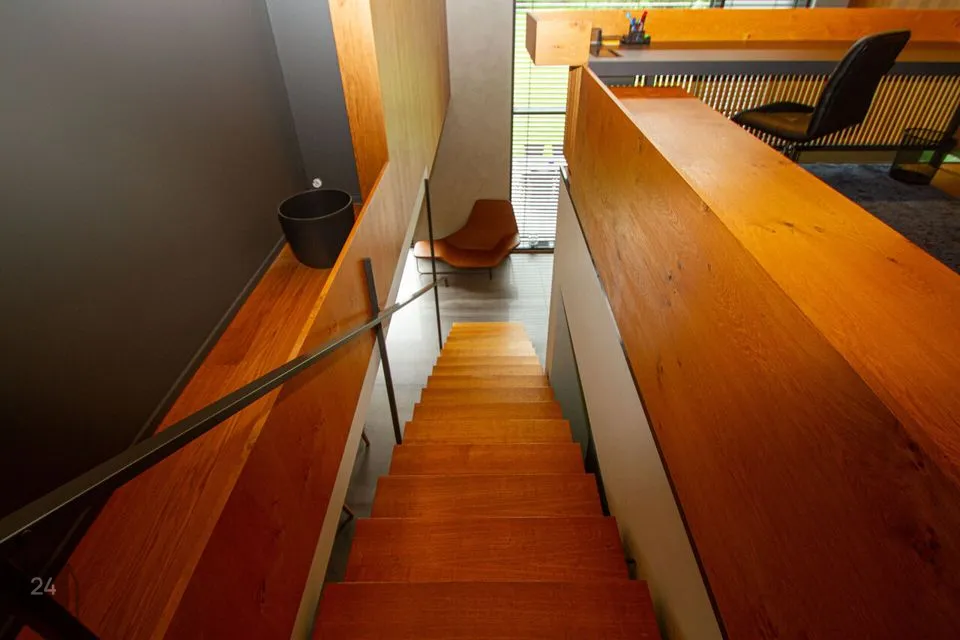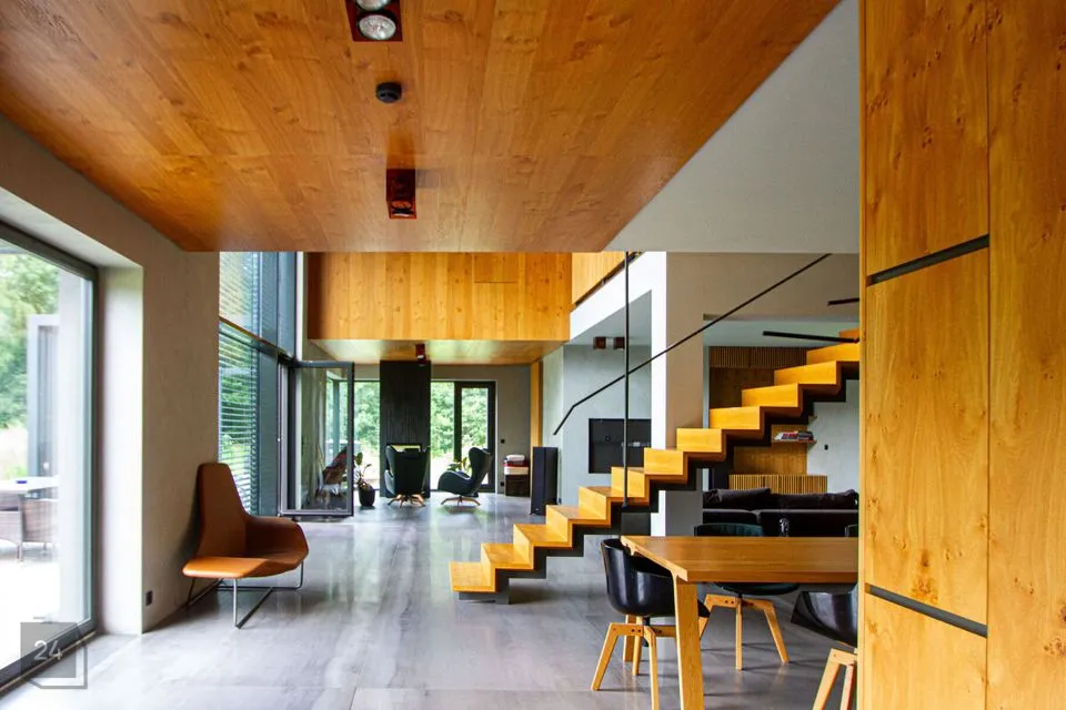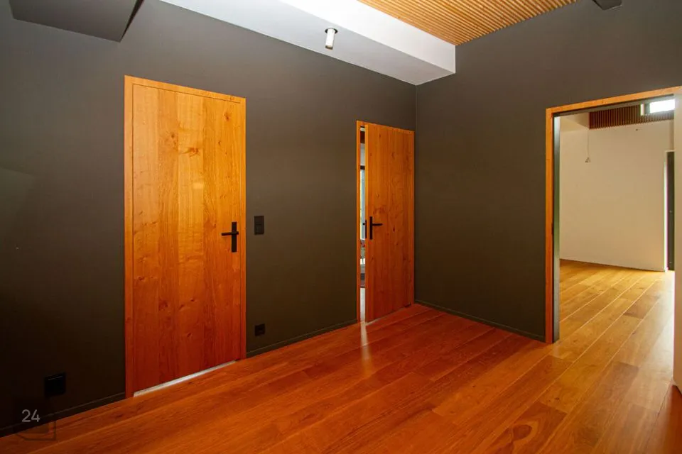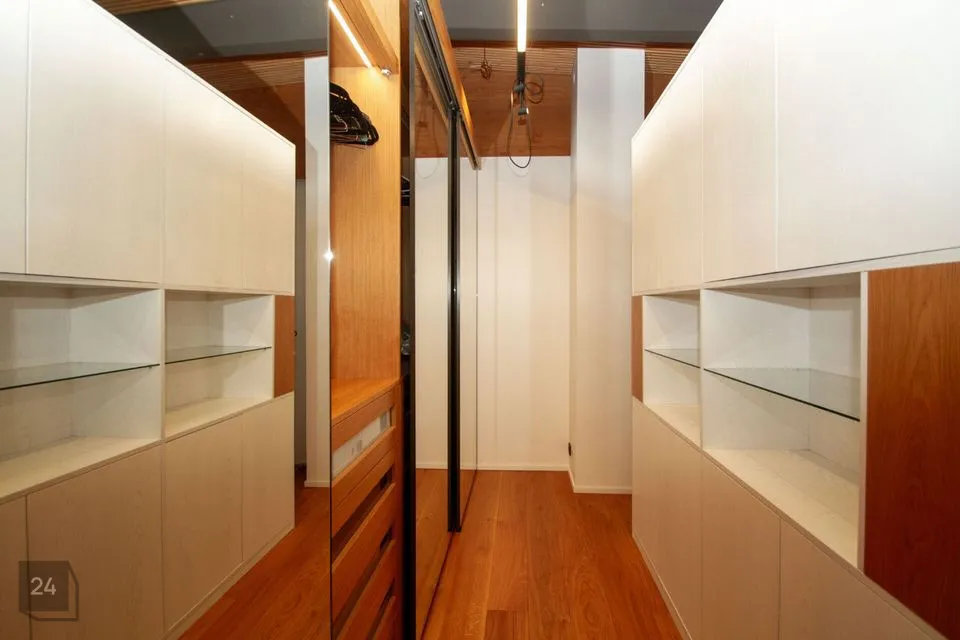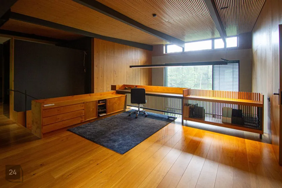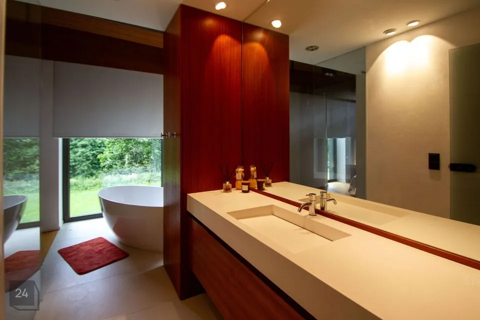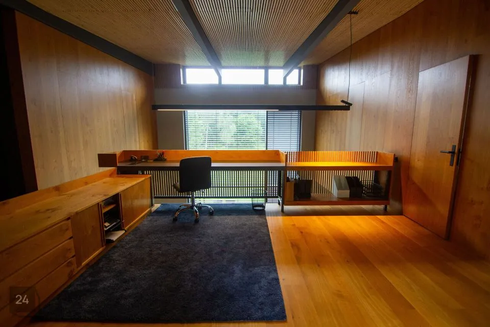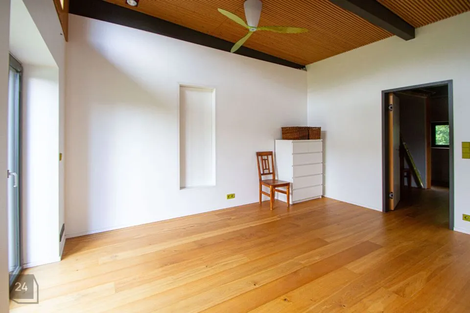 - The second section: a spacious walkthrough room that can be used as an office. Further, there is a bedroom with a spacious wardrobe, a shower room, and a cozy corner with a bathtub with a view of nature thanks to the large windows.