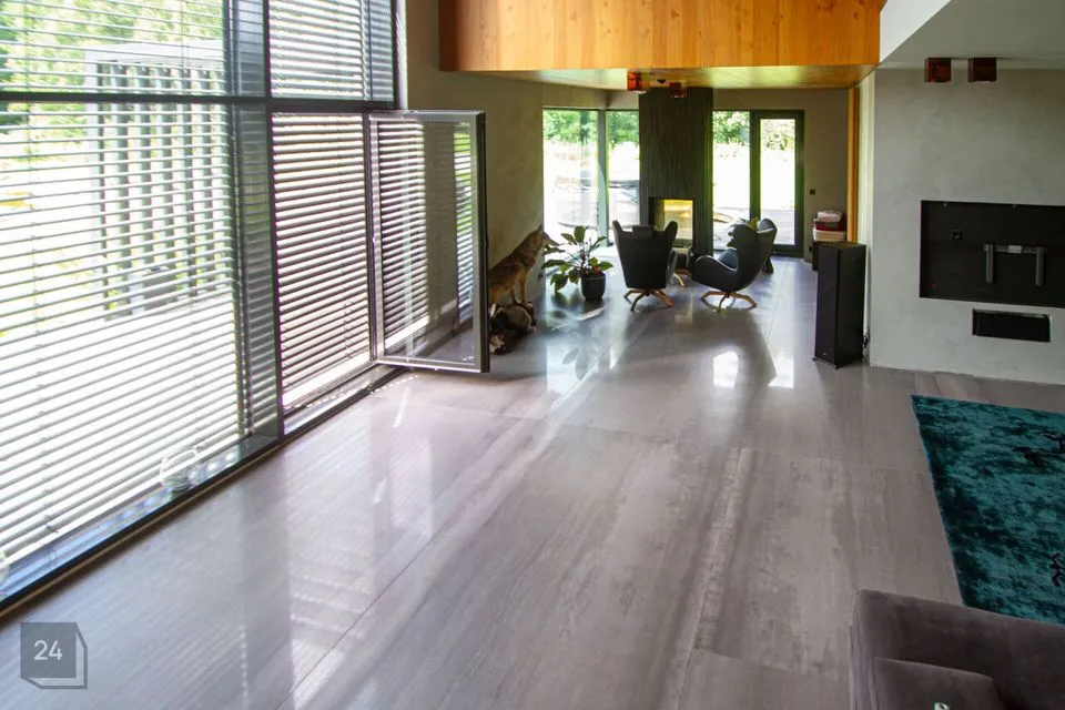 - High ceilings and large windows create a sense of spaciousness and comfort, with blinds installed on the windows.