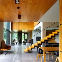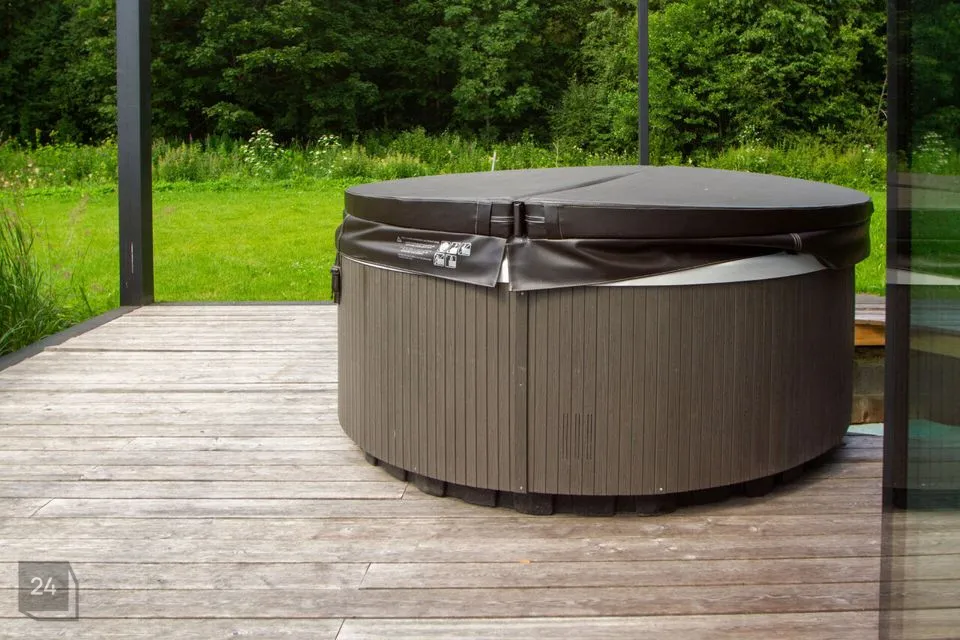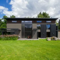 In front of the house, there is a large terrace where it is pleasant to spend time enjoying the view of the lake and nature. An outdoor sauna is installed on the side of the terrace.