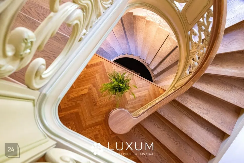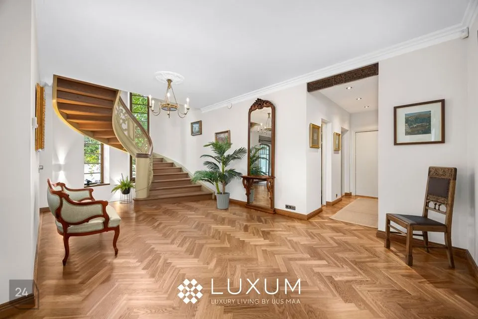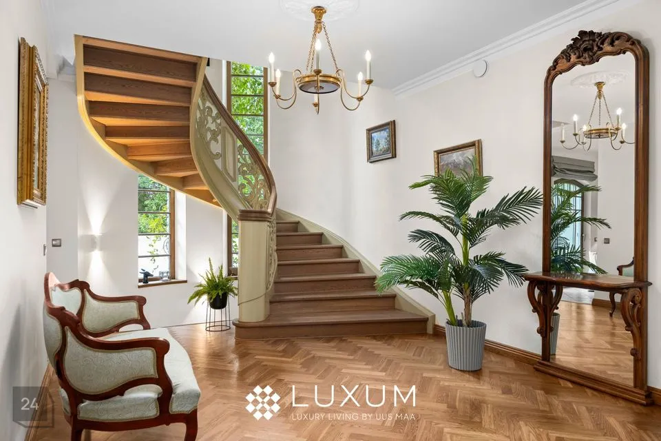 Peauksest sisse astudes võtab vastu eksklusiivne trepihall – avar, kõrgete lagedega ruum, mis rõhutab selle kodu esinduslikkust.