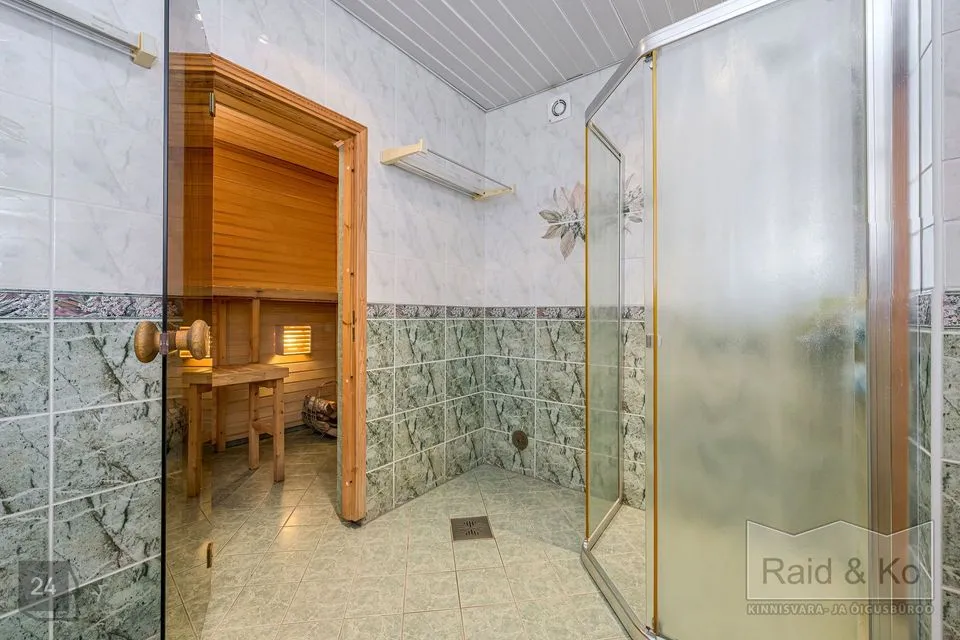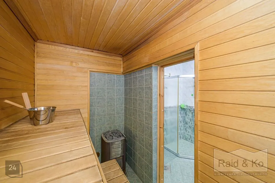 I korrusel on kõrge laega elutuba, köök-söögituba, kaminaruum, puuküttega saun, duširuum, WC ja majandusköök.