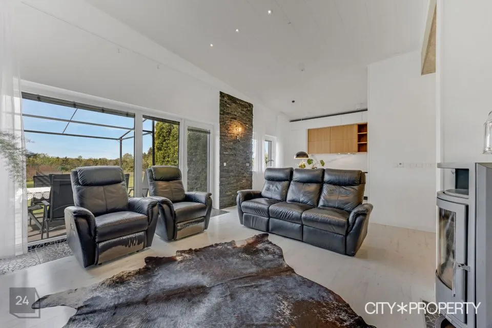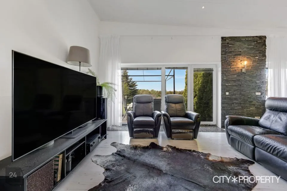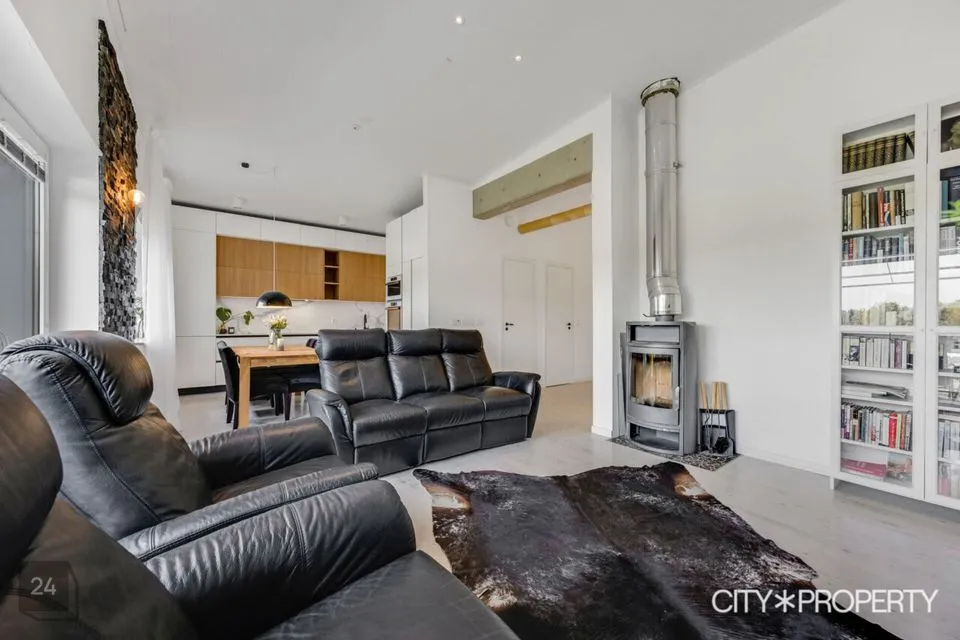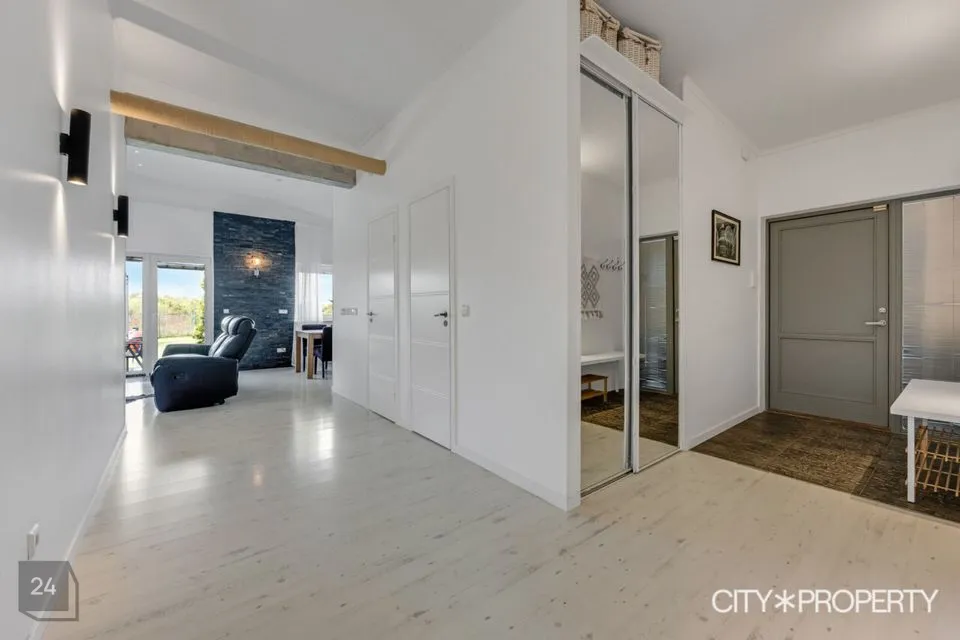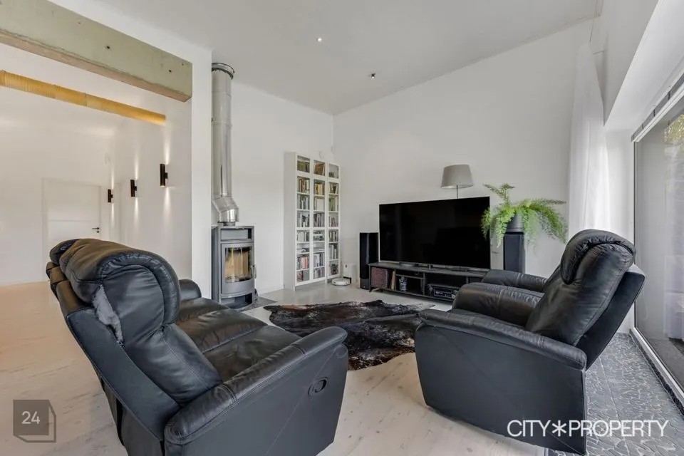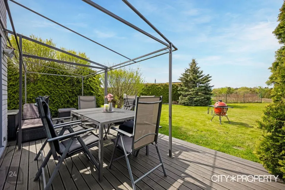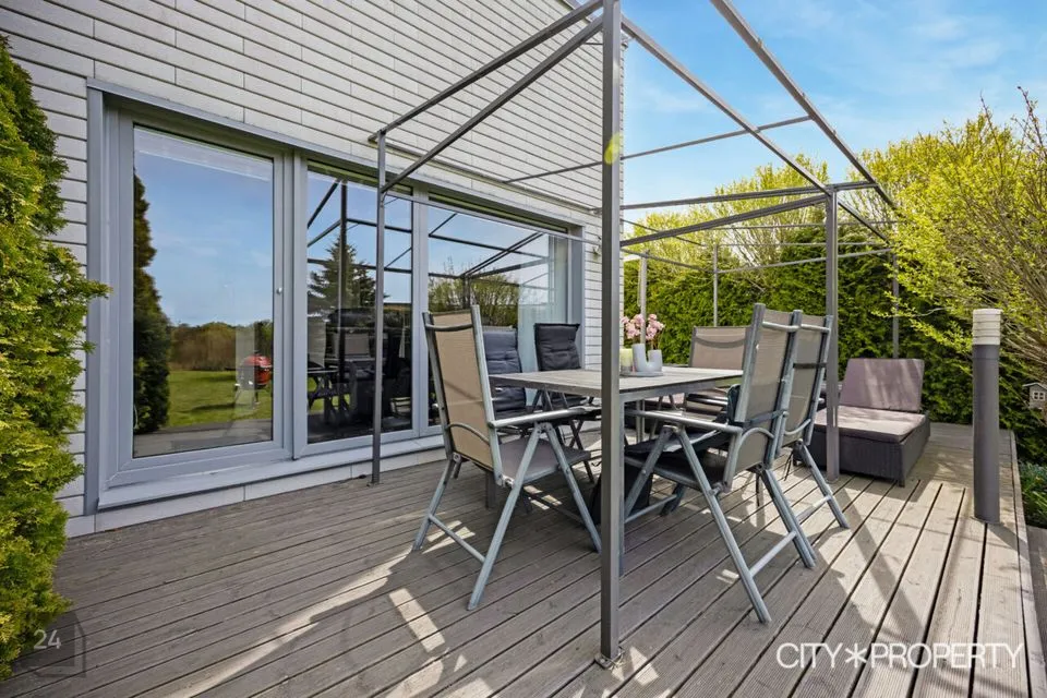 Suurtest akendest pääseb ruumikale terrassile, mis on varikatusega ja mitmesse ilmakaarde avatud. Elutoa metallkamin lisab hubasust ja vajadusel soojendab kogu kodu.