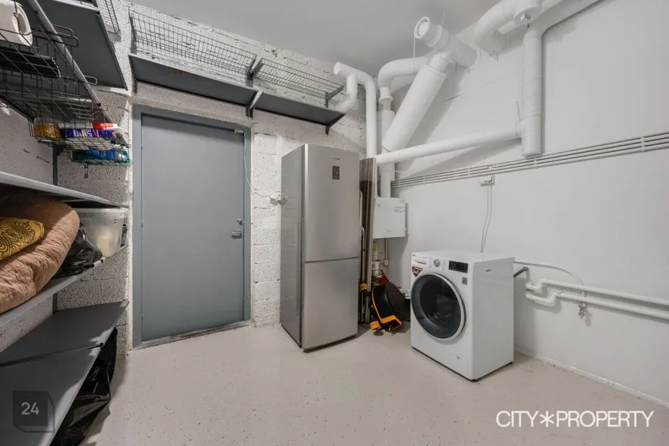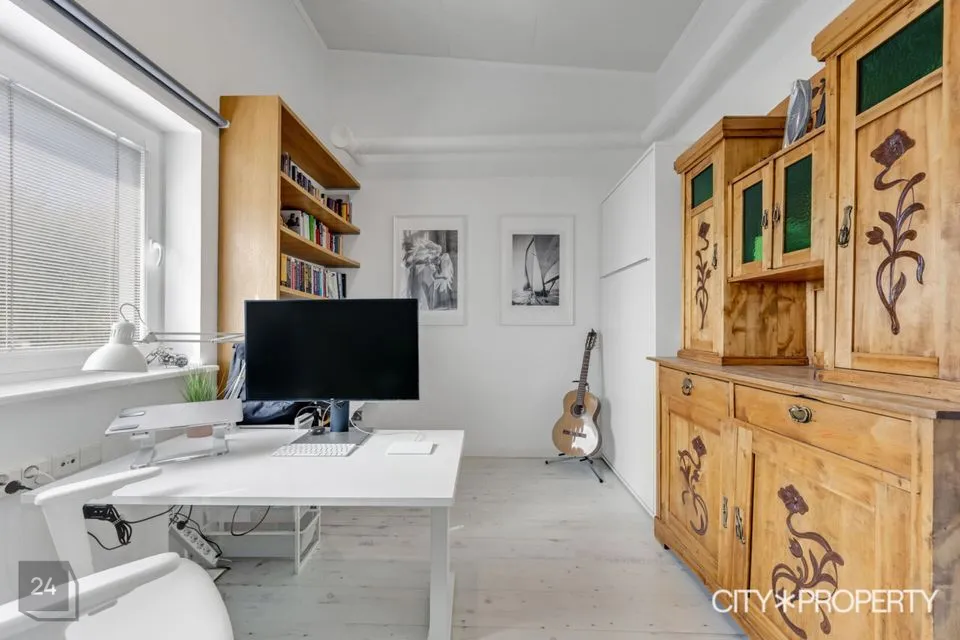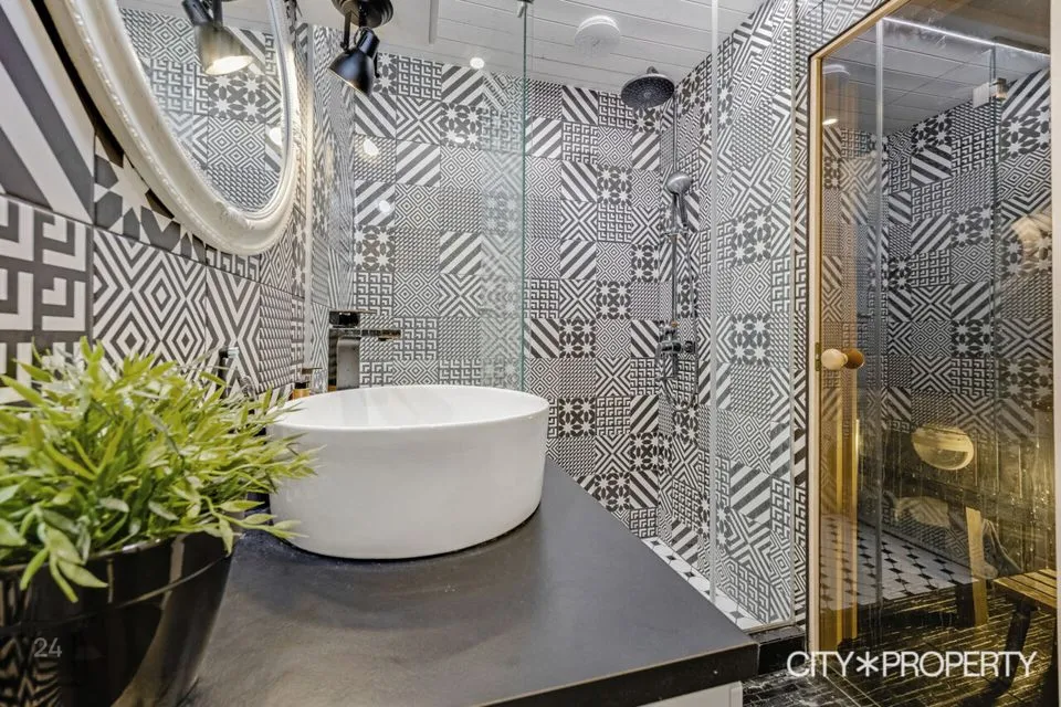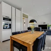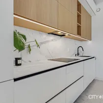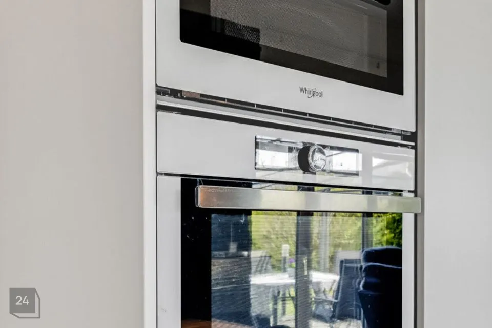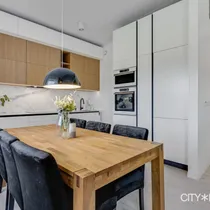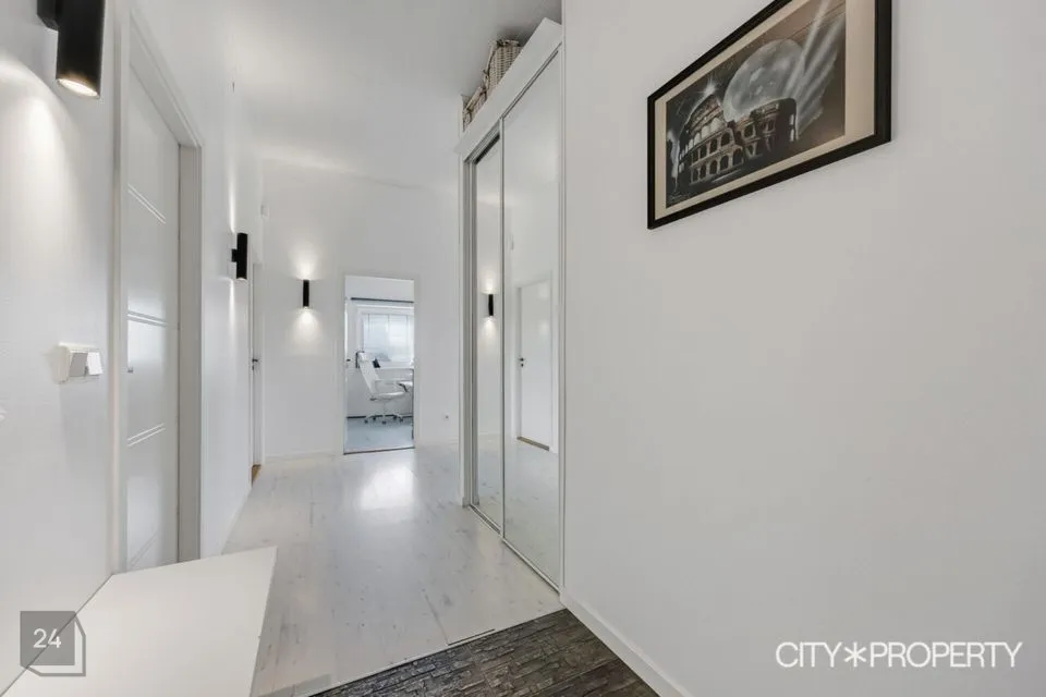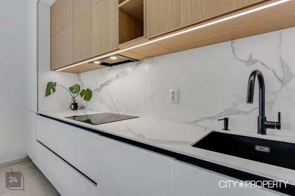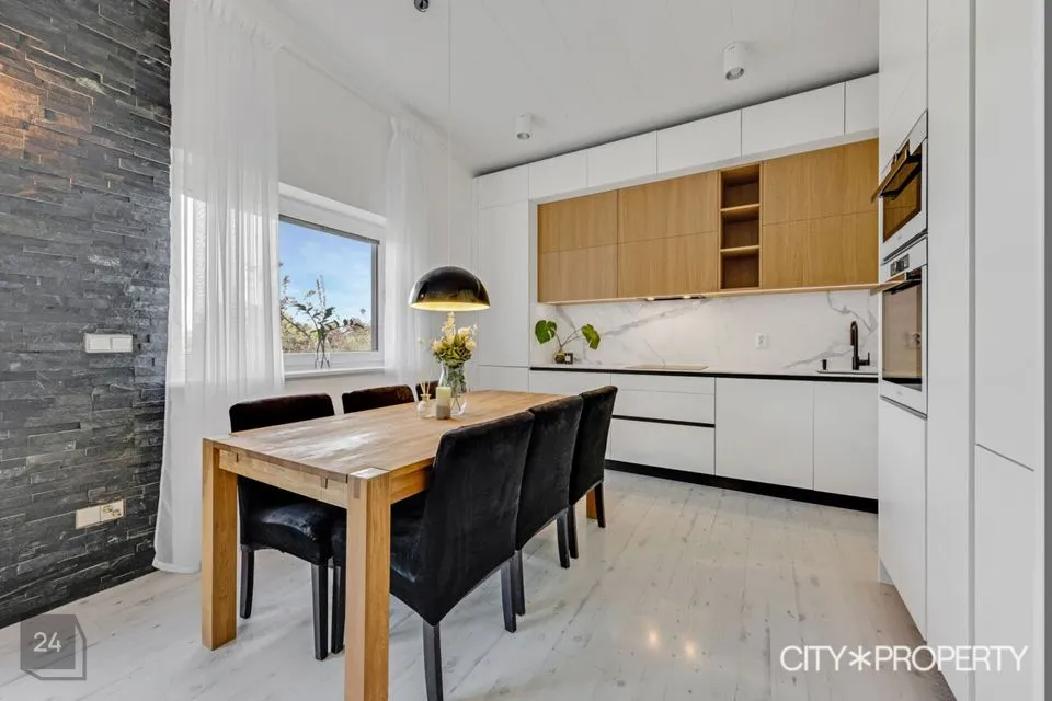 Köök on sisustatud eritellimusmööbliga (Holzmaier), millele lisab elegantsi Nerosteini keraamiline tööpind. Kodutehnika pärineb usaldusväärsetelt tootjatelt – Electrolux ja Whirlpool, sanitaartehnika firmalt Franke.