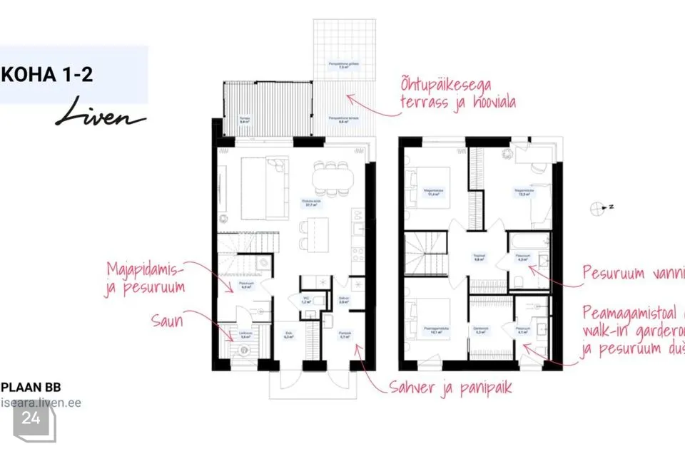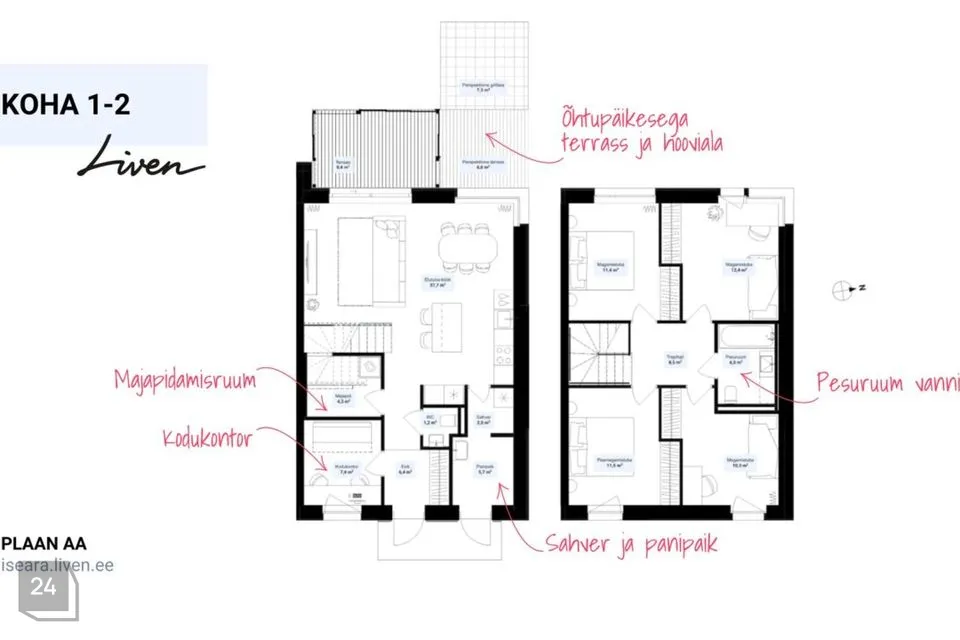 Selle nelja- või viietoalise Iseära ridakodu 1. korrusel on avar elutuba-köök, kust pääseb lükandakna kaudu terrassile ja oma hoovialale. Lisaks on sel korrusel eraldi tualettruum, kodukontor ja majapidamisruum või hoopis saun pesuruumiga ning sahver ja panipaik pääsuga nii toast kui õuest. Kodu 2. korrusel on kolm või neli magamistuba – vali Sulle sobiv lahendus, lisaks eraldi pesuruum vanniga. Maja ees on kaks parkimiskohta.