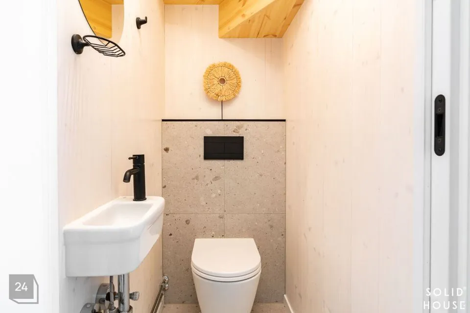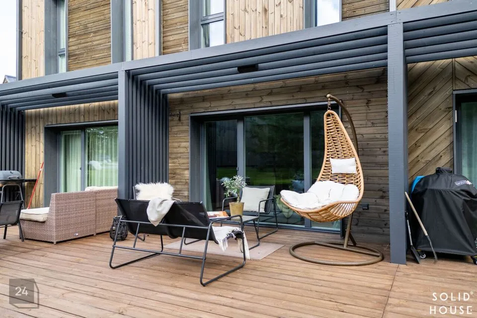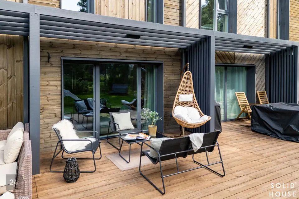 Fassaadil on kasutatud eri mustriga männipuitu ja naturaalseid materjale, mis annavad elamule põhjamaise sooja ja hubase ilme. Hoone konstruktsioonid on tugevad ja energiatõhusad: terasraam, soojustatud seinad, kolmekordse klaaspaketiga aknad.