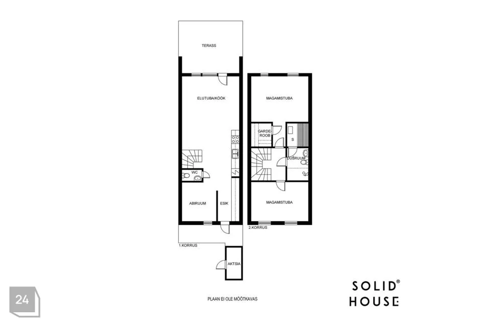 Esimesel korrusel paiknevad valgusküllane elutuba avatud köögiga, eraldi WC ning praktiline abiruum/ või kodukontor. Elutoast pääseb otse terrassile, mis on mõnusalt ümbritsetud mändidega.