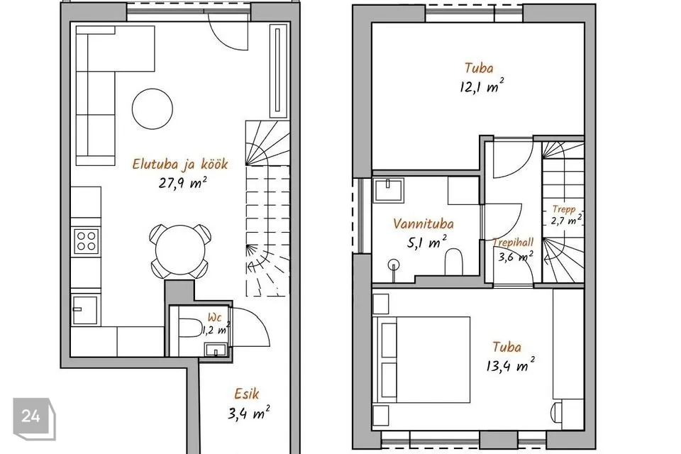 2 magamistuba — suurem tuba hommikupäikese, väiksem õhtupäikese poole