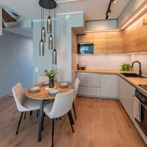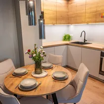 Elutoas diivan, diivanilaud ja telerialus, köögis laud ja toolid