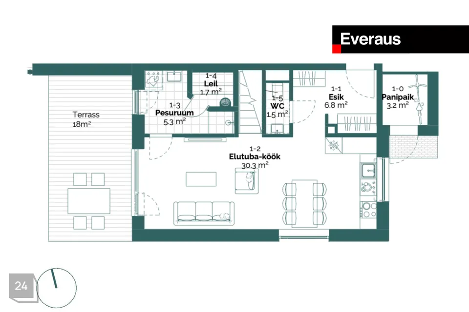 Korter nr 1 on 4-toaline suurusega 94,3 m2 (koos 3,2 m2 panipaigaga), 18 m2 terrassi ja 167 m2 hoovialaga. Korteris on avatud köögiga elutuba ja kolm magamistuba. Korterile lisab avarust terrass maja lääneküljes.