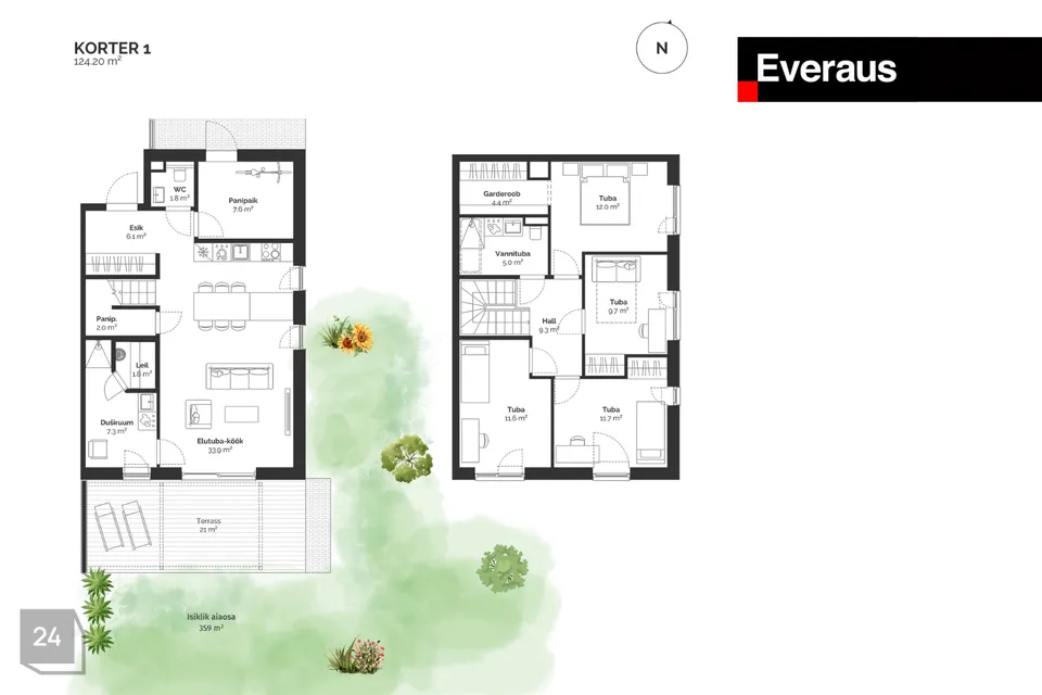 Korter nr 1 on 5-toaline suurusega 124,2 m2 (koos 7,6m2 panipaigaga), 21 m2 terrassi ja 359 m2 hoovialaga. Korteris on avatud köögiga elutuba ja neli magamistuba. Korterile lisab avarust terrass maja lõunaküljes.