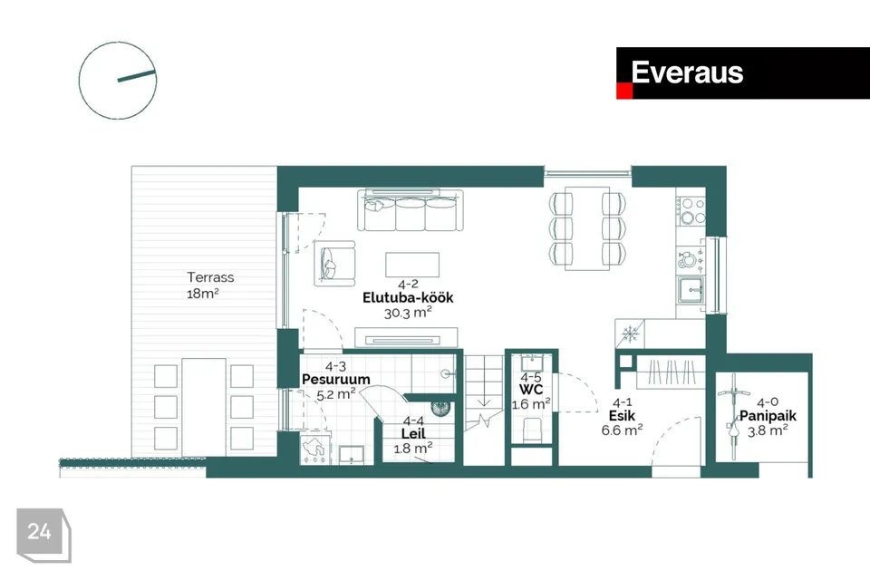 Korter nr 4 on 4-toaline suurusega 94,4 m2 (koos 3,8 m2 panipaigaga), 18 m2 terrassi ja 144 m2 hoovialaga. Korteris on avatud köögiga elutuba ja kolm magamistuba. Korterile lisab avarust terrass maja lõunaküljes.