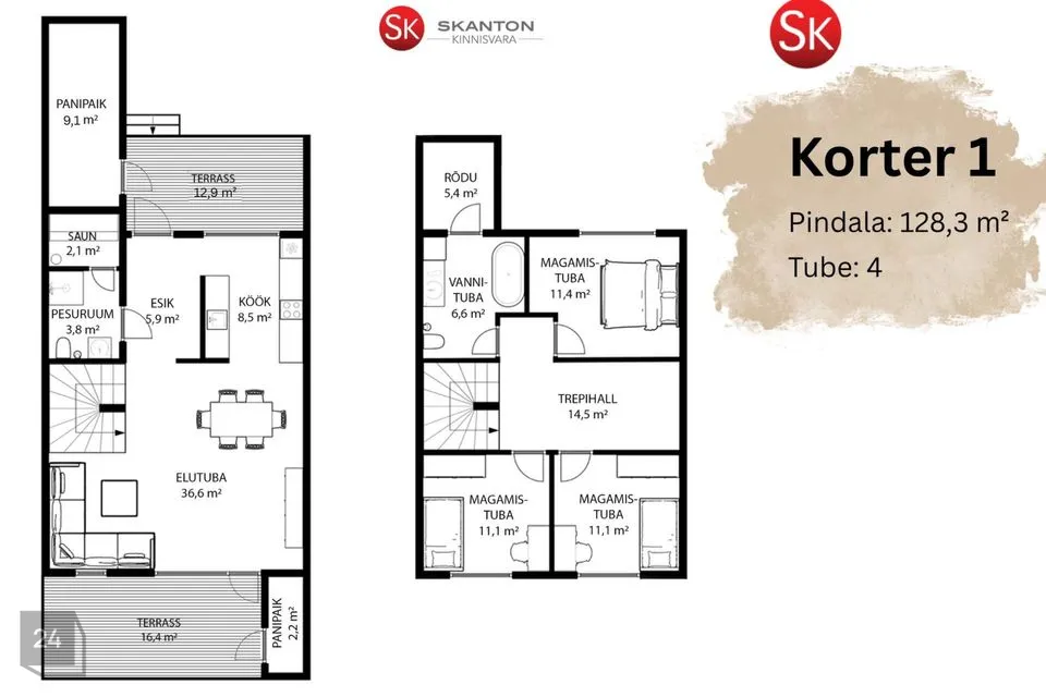 - 3 magamistuba (11,4 m2, 11,1 m2, 11,1 m2)