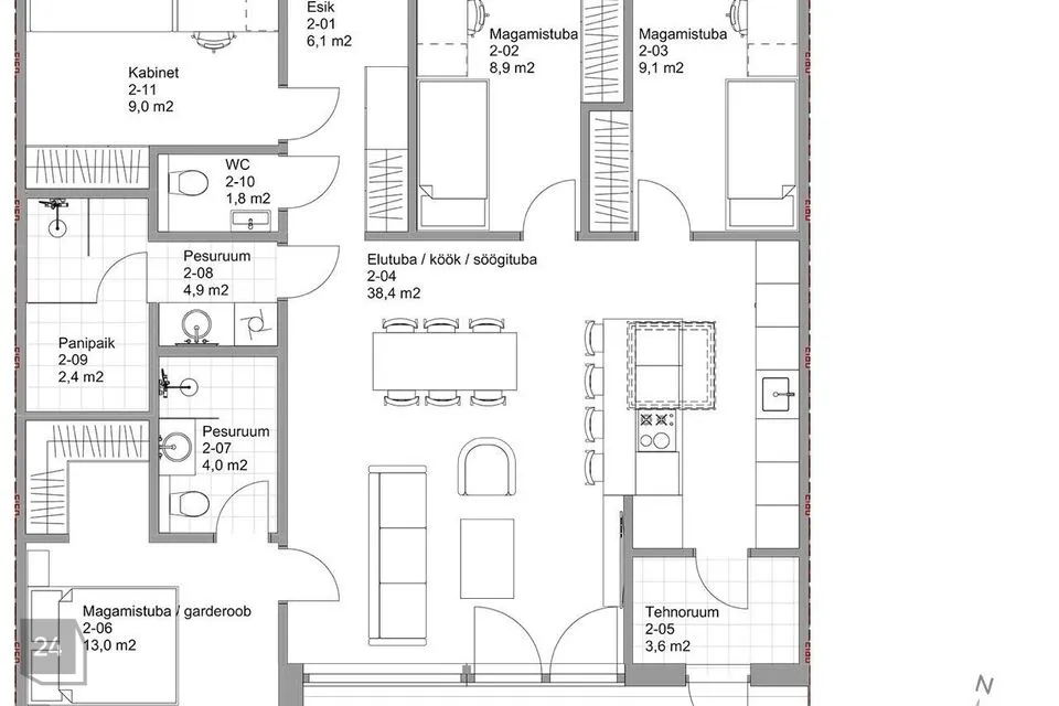 Põrandatel on mattlakiga 1-lipiline tammespooni parkett. Esikus, majapidamisruumis ja märgades ruumides on põrandad plaaditud. Seinad ja laed on pahteldatud ja värvitud. San ruumide seinad on osaliselt plaaditud ja osaliselt värvitud.