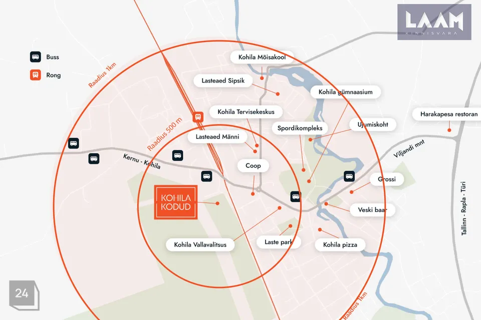 Sellest saab suurepärane koht elamiseks, sest elukorraldus Kohilas on mugav ja turvaline. Siin elades on kõik eluks vajalik jalutuskäigu kaugusel – COOP kauplus (170 m), lasteaiad (350 m), perearstikeskus (375 m), spordikompleks ja gümnaasium (520 m). Rongijaam asub 5-minutilise jalutuskäigu kaugusel. Kohila Kodud asuvad vaikses ja looduskaunis kohas. Ilusa männimetsa all on pargid ja metsarajad ning lähedal asub lai mitmete ujumiskohtadega Keila jõgi, mis läbib Kohila alevit.