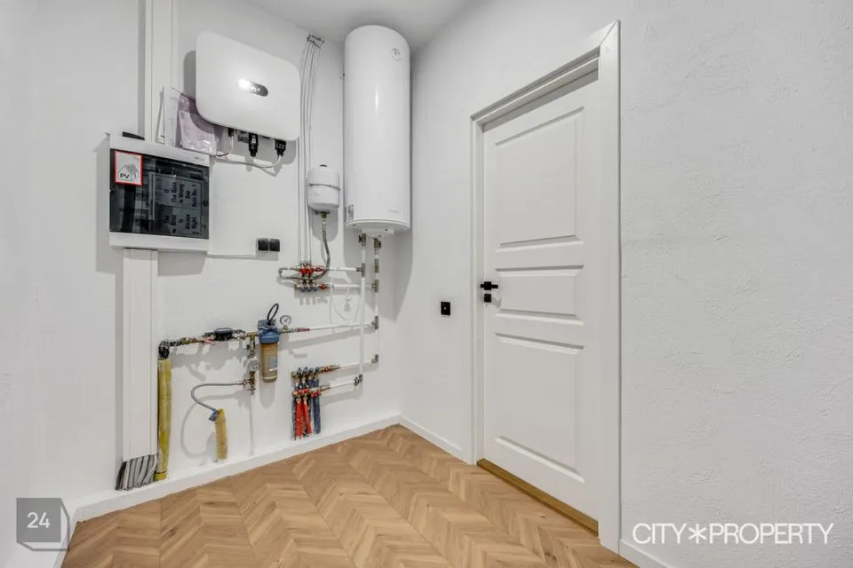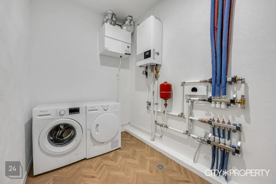 Alumisel korrusel on vesipõrandaküte, mis tagab mõnusa ja ühtlase soojuse kogu elamispinnal, ning ülemisel korrusel on radiaatorid, pakkudes paindlikku temperatuuri reguleerimist magamistubades.