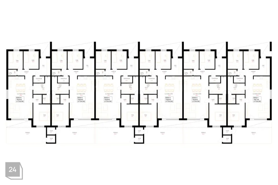 Hoovialade suurused on keskmistel boksidel 117-119 m² ja otsaboksidel 383 m² ning 500 m². Iga ridaelamuboksi juurde kuulub kuur, kuhu pääseb terrassilt.