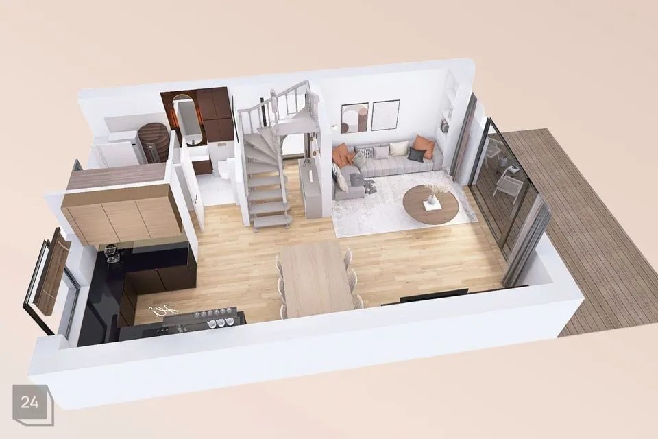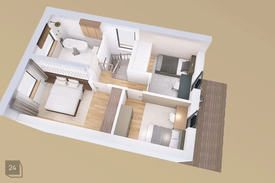 Ridaelamu koosneb kolmest suurepärase, läbi kahe korruse planeeringuga valgusküllasest korterist. Igasse korterisse on projekteeritud 4 tuba (3 magamistuba ning elutuba). Iga korteri esimesel korrusel asub esik, wc, tehnoruum, avatud köök. Iga korteri teisel korrusel asub lisaks kolmele magamistoale koridor ning vannituba.