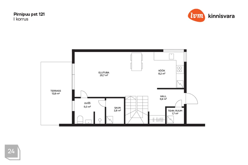Esimesel korrusel on esik; panipaik/tehnoruum; avatud köök-elutuba, kust pääs terrassile; saunaga pesuruum (elektrikeris), kust samuti pääs terrassile.