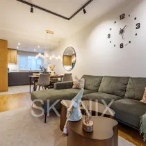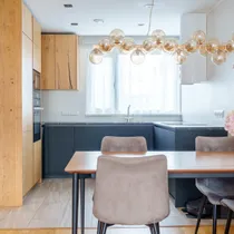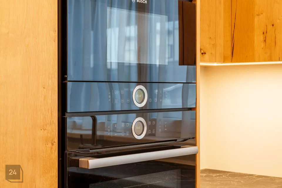 - Eritellimusel köök: Köögimööbel on tellitud mainekalt tootjalt "Arens". Kasutatud on naturaalset tammespooni ja vastupidavat nano-tehnoloogilist Fenix-katet. Tehnika on BOSCH tipp-seeriast (6 ja 8), sisaldades ka suurt külmikut (lisaks on panipaigas eraldi sügavkülmik).