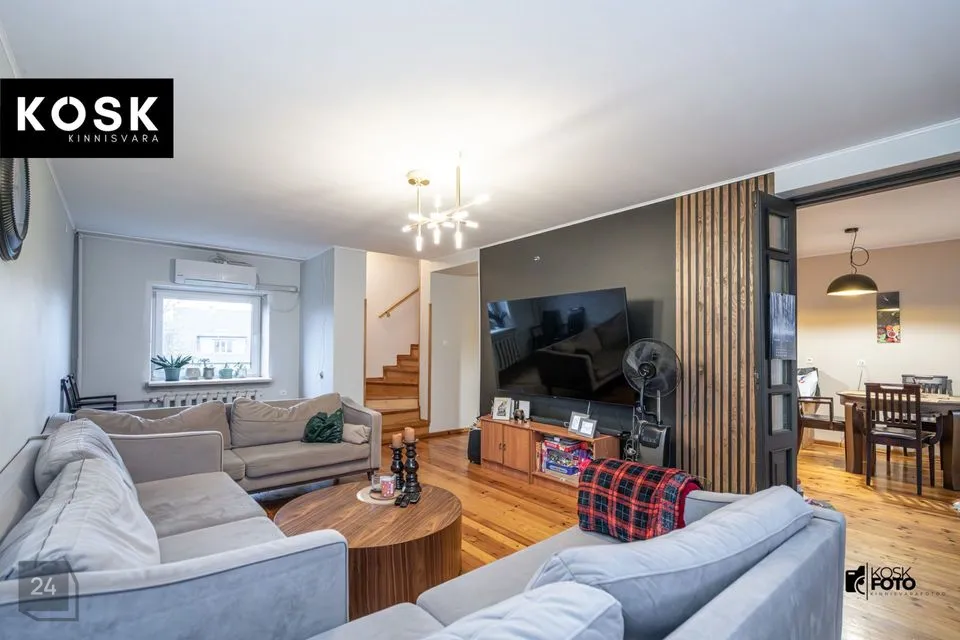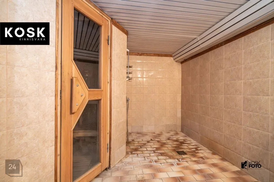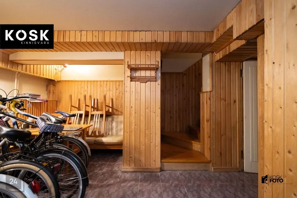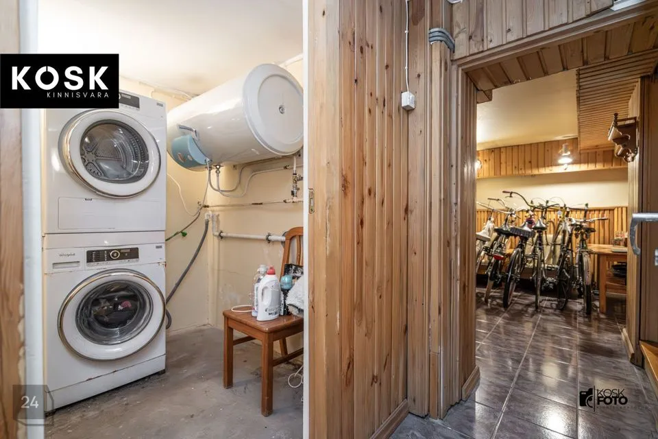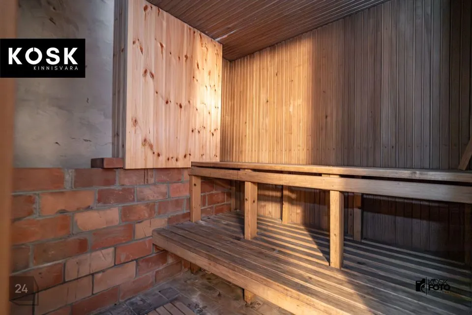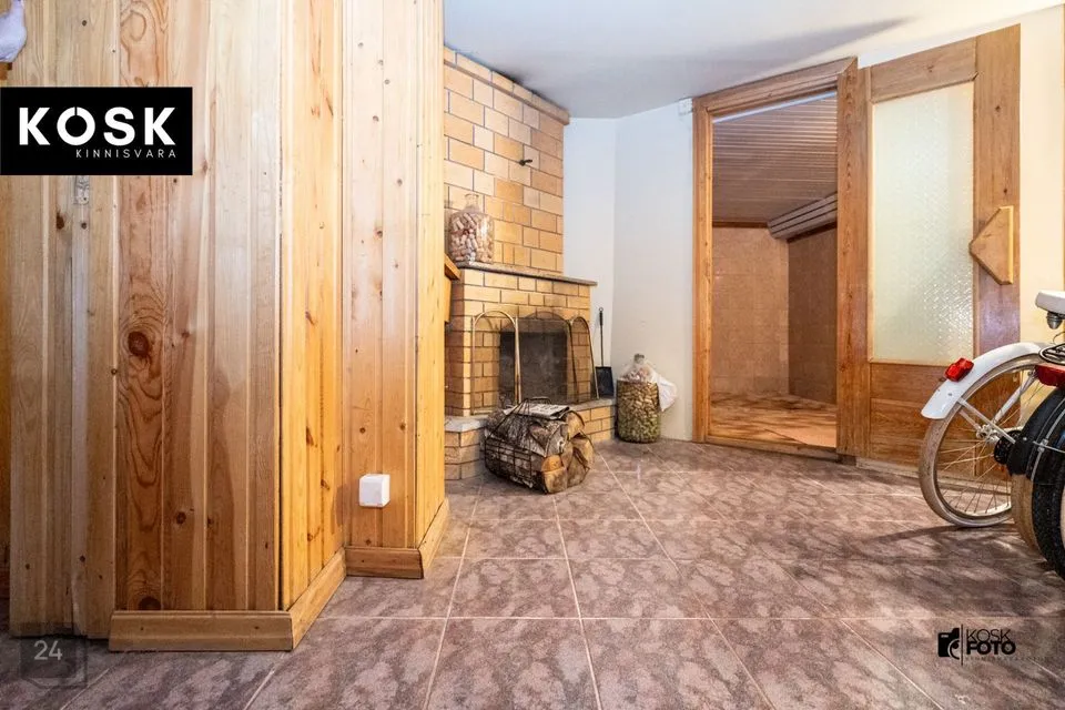 Heating is versatile and flexible: district heating with radiators, plus fireplaces, a stove in the sauna room, and an air heat pump that also functions as cooling.