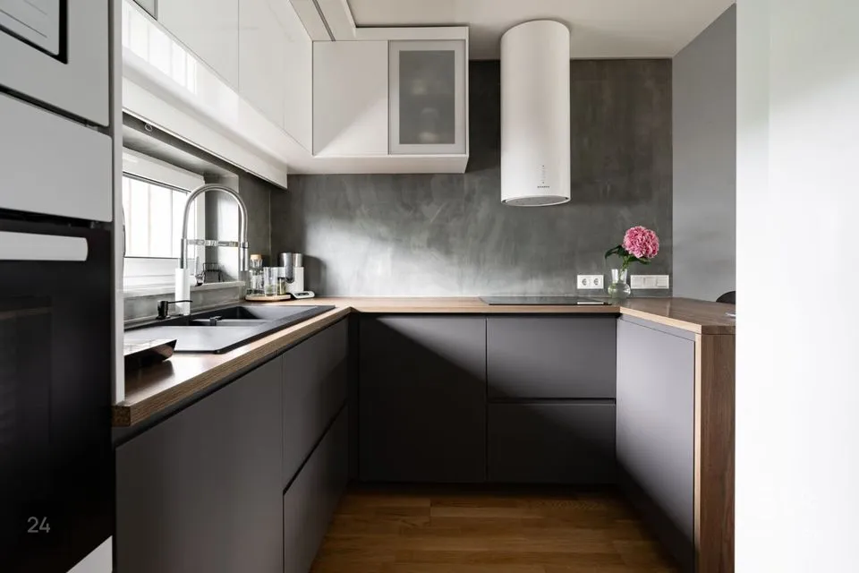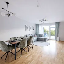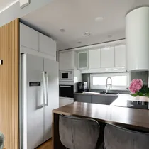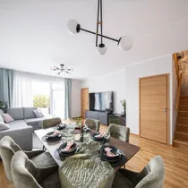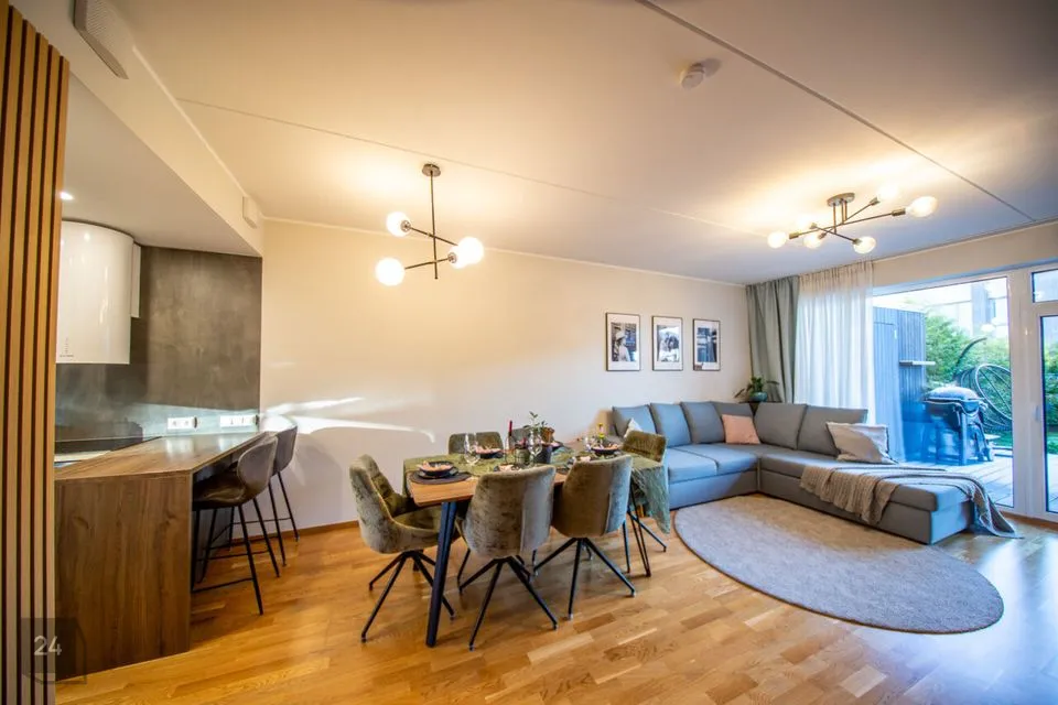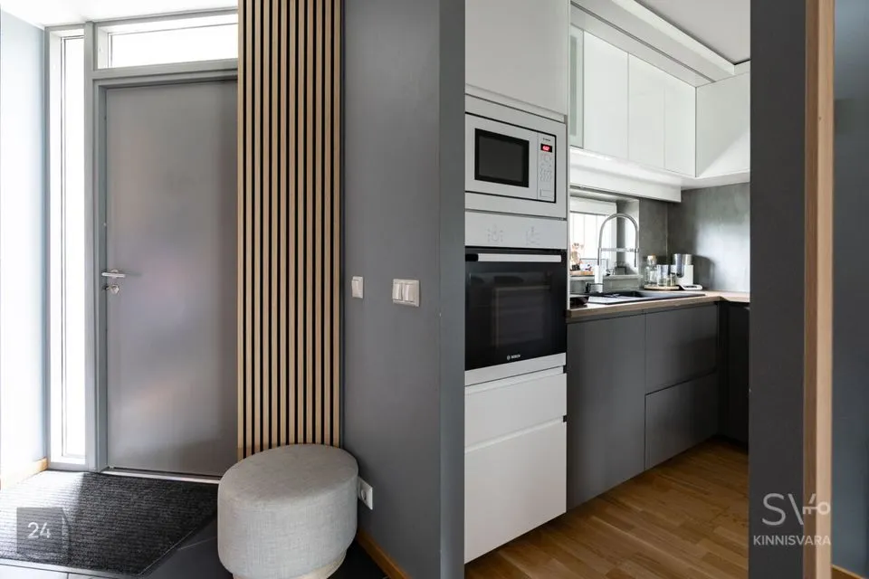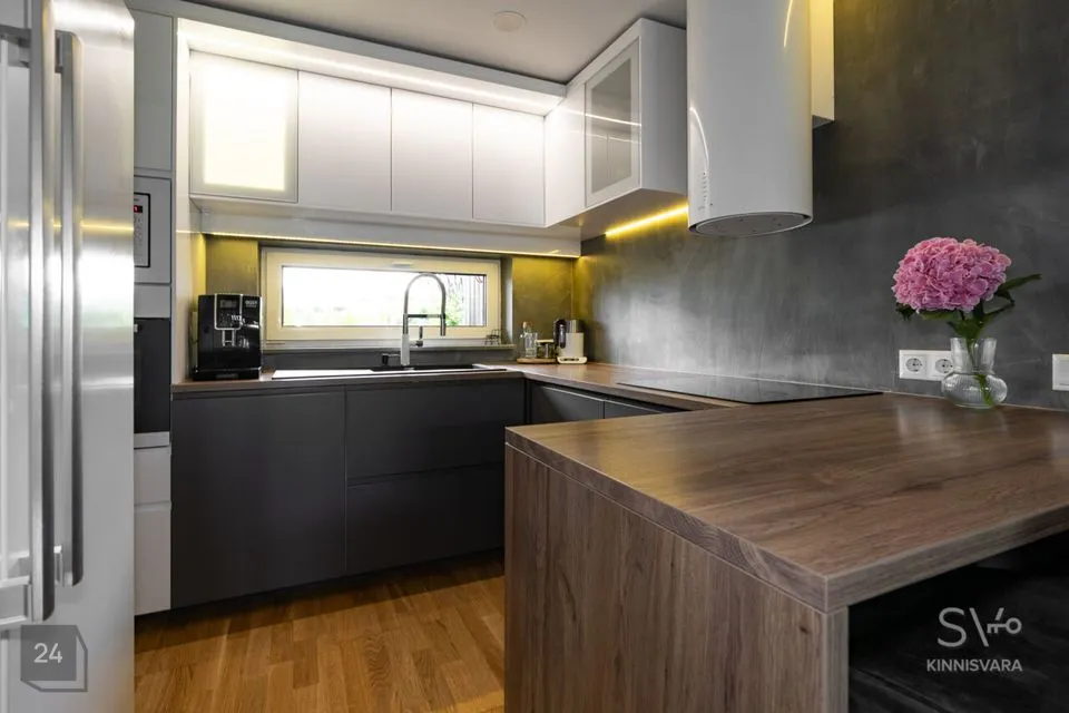 Kaasaegne köök (6,3 m²), mis on sisustatud köögimööbli ja vajaliku tehnikaga (induktsioonpliit, õhupuhasti, ahi, külmik, nõudepesumasin).