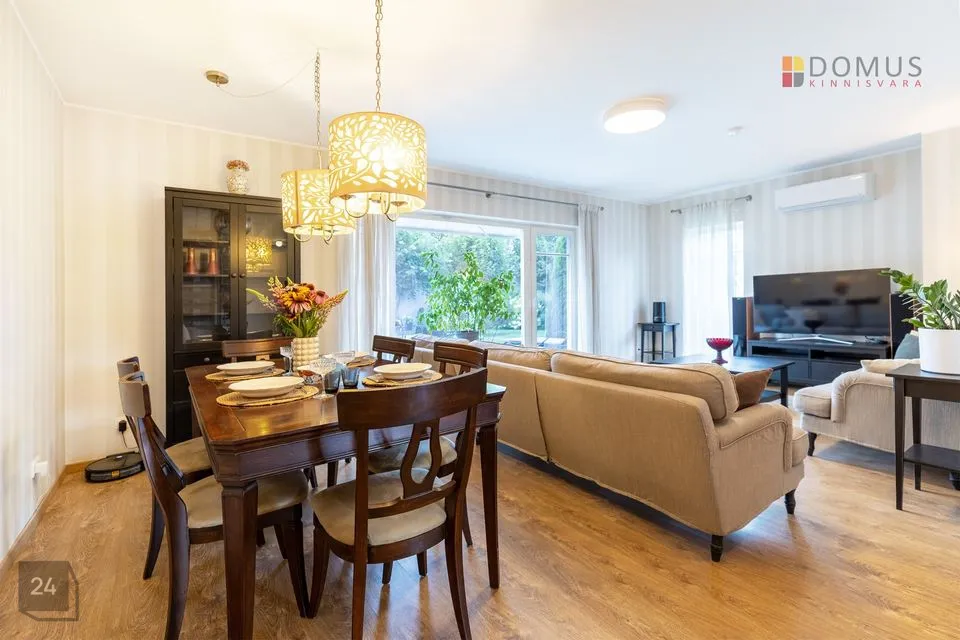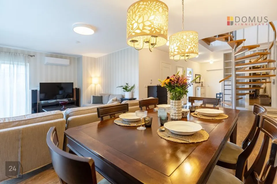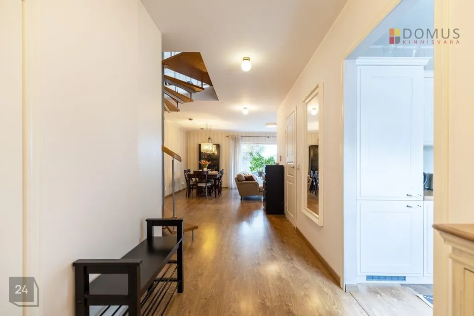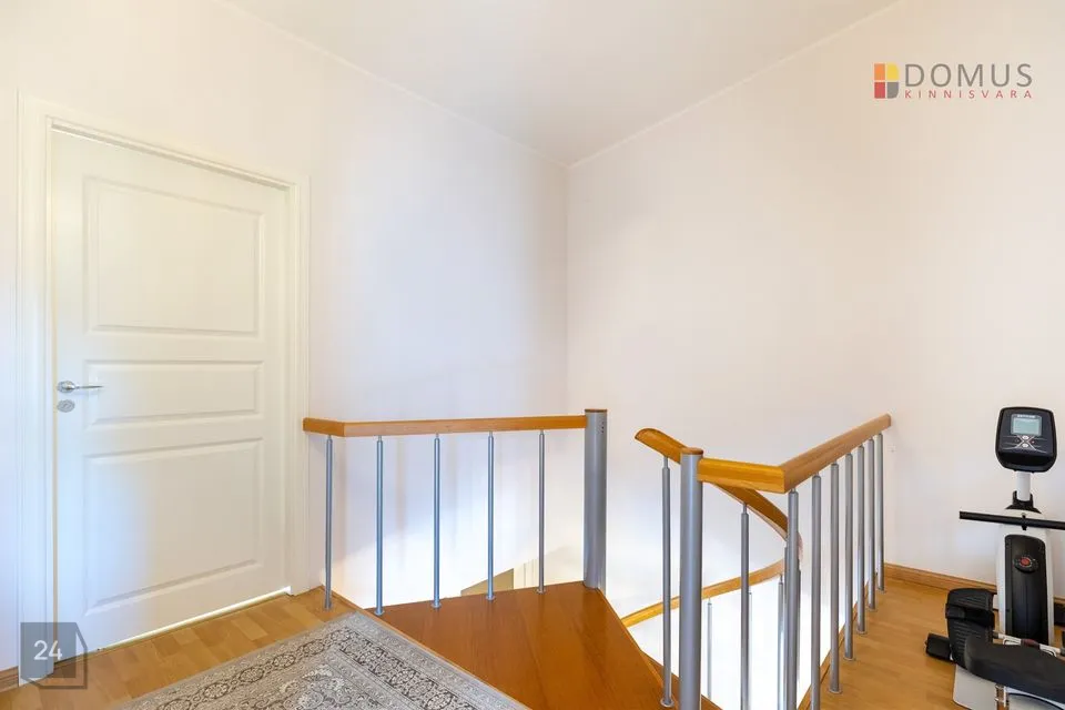 Esimesel korrusel on esik, köök, kütteseadmete ruum/panipaik, trepihall + garderoob, duširuum, saun, elutuba ja terrass. Teisel korrusel on trepihall, vannituba ja 3 magamistuba, millest ühes on ka suurem garderoob. Tubade seinad on värvitud või kaetud tapeediga. Laed on valget värvi ja võrreldes mõne teise sarnase ridamajaga on kõrged. Põrandat katab I korrusel naturaalne parket ja II korrusel laminaatparkett. Pesemisruumides on põrandad ja seinad plaaditud. I korruse duširuum on hiljuti täielikult renoveeritud.