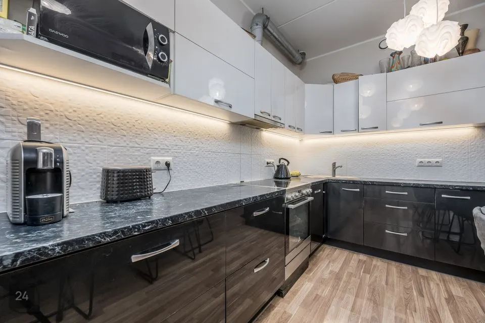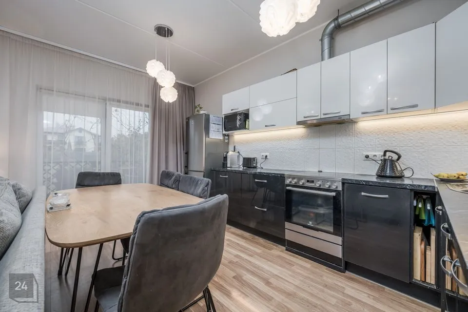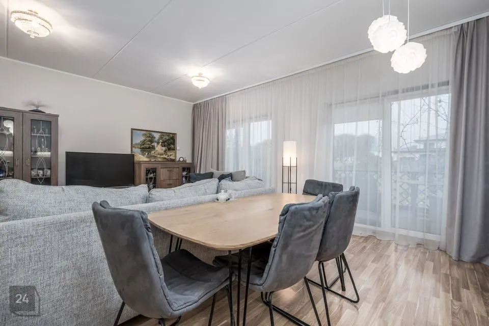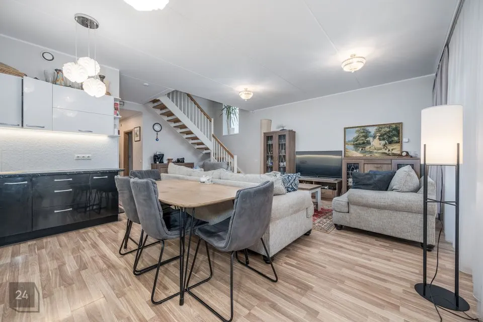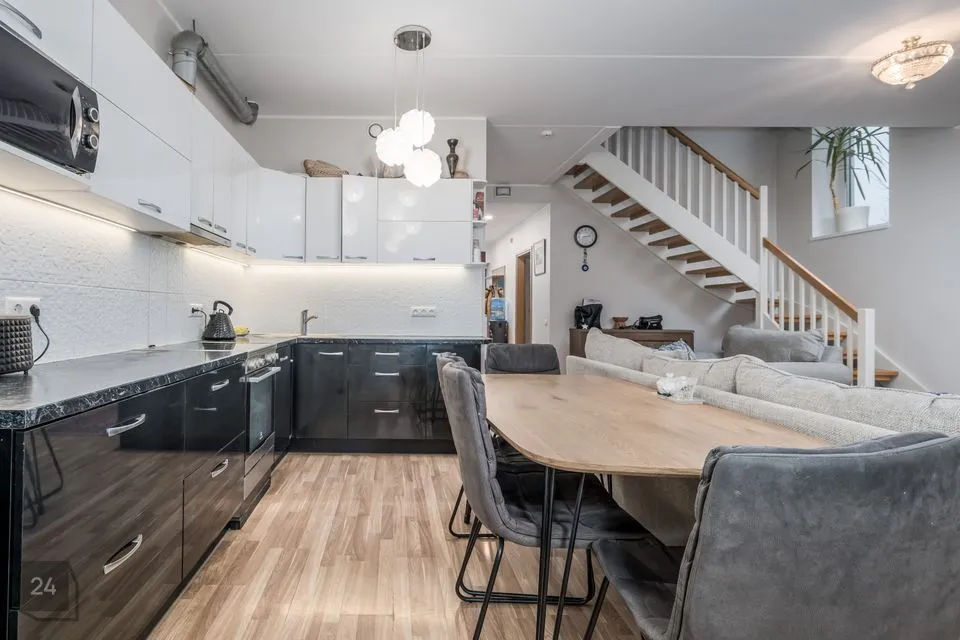 Edasi viib meid kodu südamesse - avatud köök elutoaga, mille suurus kokku on 40,6m2. Köök mahutab endas köögimööbli koos vajaliku koduthenikaga ja samuti mahub sinna suur söögilaud, kus võiks vabalt kuus pereliiget hommikust süüa.