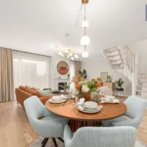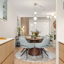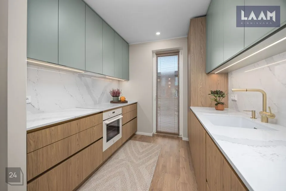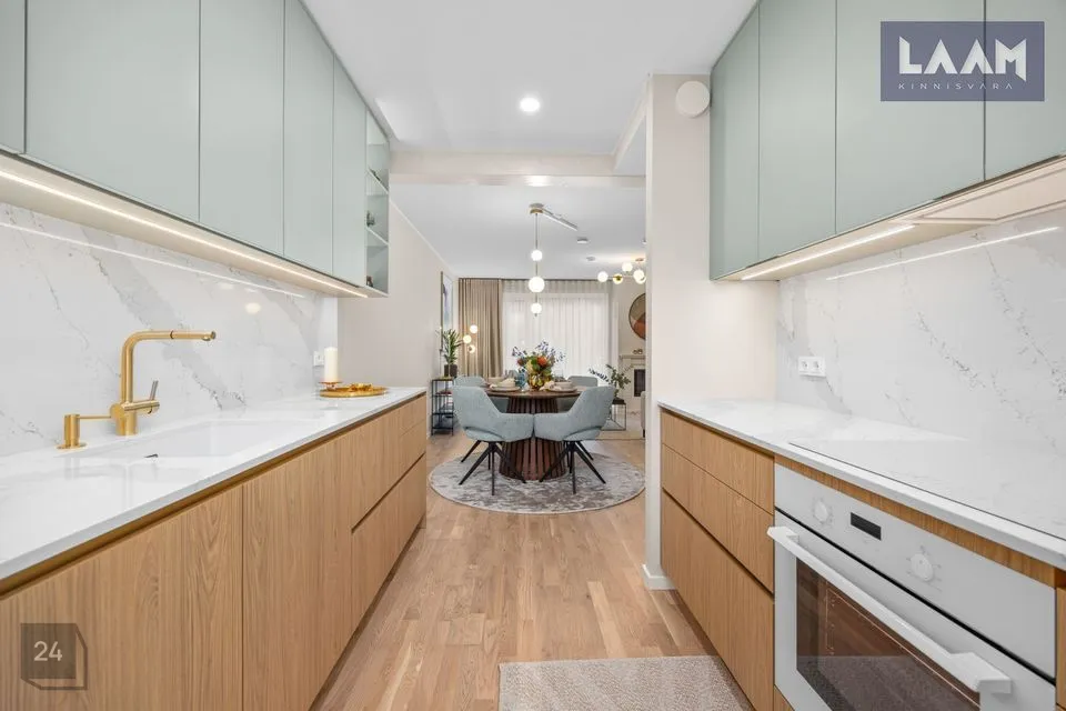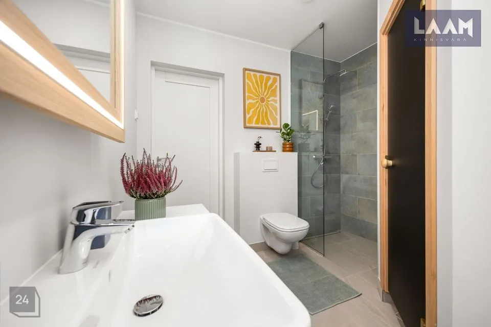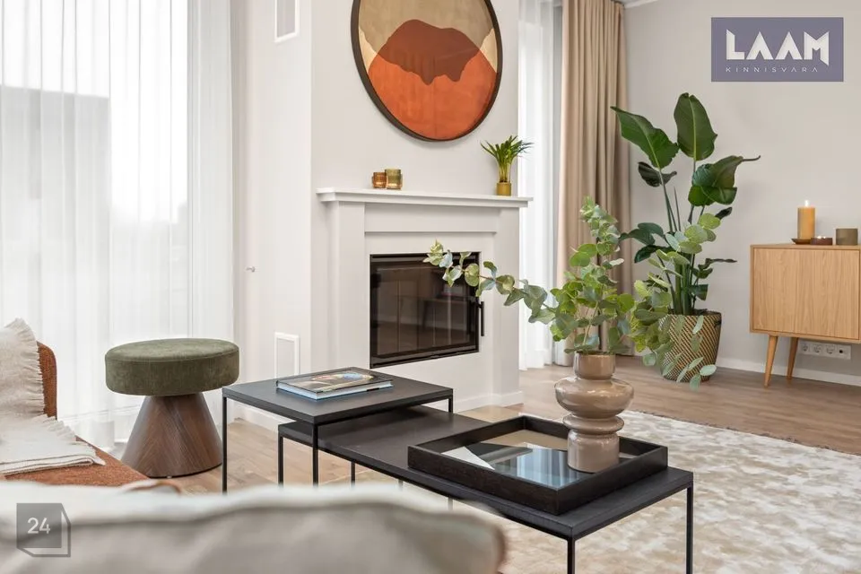 •Siseviimistlusega luuakse hubane kodu, kus on mahedad toonid ja kvaliteetsed materjalid. Kasutatud on naturaalset tammepuitparketti, keraamilisi plaate ja SWEDOOR'i mantelservaga massiivuksi. Sanitaartehnika firmadelt DURAVIT ja HANSGROHE.