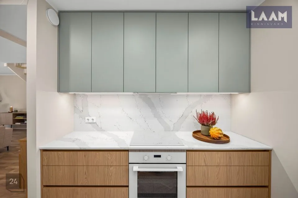 •Siseviimistlusega luuakse hubane kodu, kus on mahedad toonid ja kvaliteetsed materjalid. Kasutatud on naturaalset tammepuitparketti, keraamilisi plaate ja SWEDOOR'i mantelservaga massiivuksi. Sanitaartehnika firmadelt DURAVIT ja HANSGROHE.