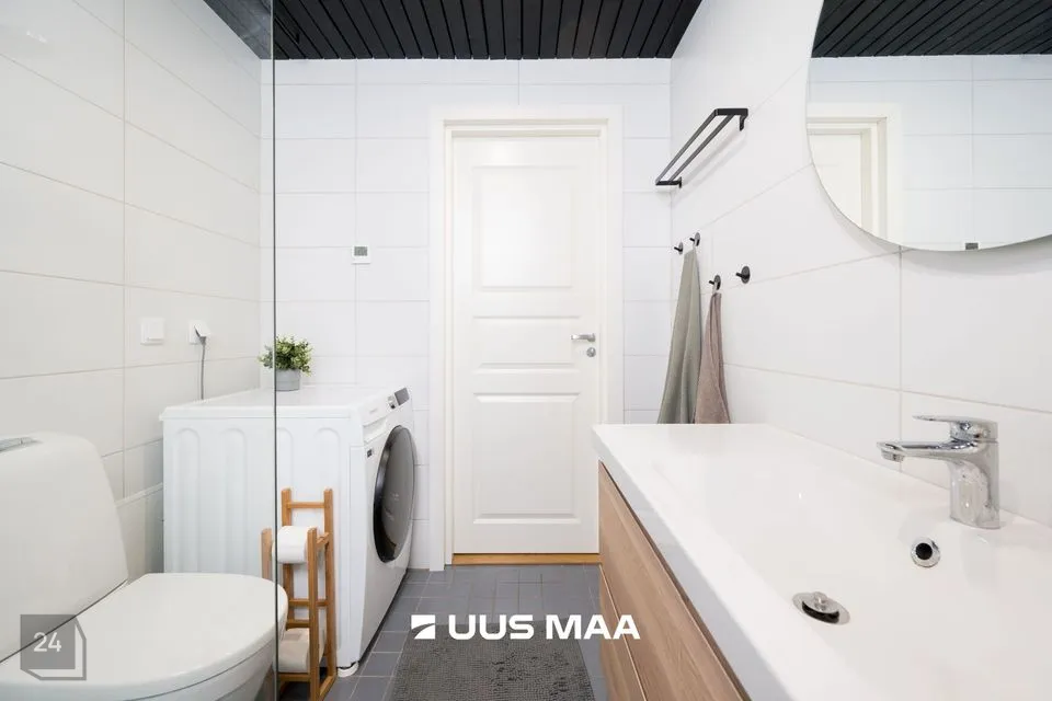 Põrandaid katab naturaalne parkett, vannituba on plaaditud, akendeks on 3-kordsed klaaspakettaknad ning ventilatsioon on alumise korruse WC-s ja ülemise korruse duširuumis ventilaatoritega (KVK Slim 125, Systemair) väljatõmme. Mujal tubades on manuaalselt juhitavad fresh klapid.