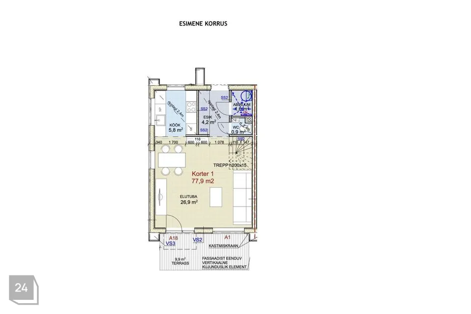 Koosseisu kuulub esimesel korrusel avatud köögiga elutuba, eraldi WC, tehnoruum ja esik.