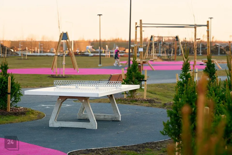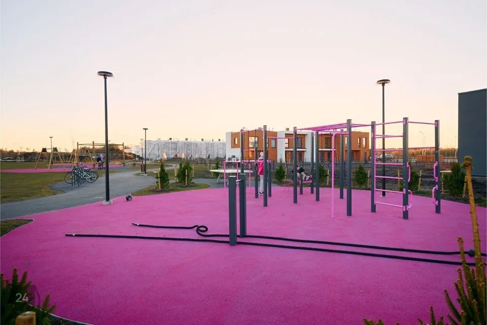 / Eraldi õuelinnak eri vanuses mänguväljakute, välijõusaali, jooga-ala, ning võrkpalliplatsiga