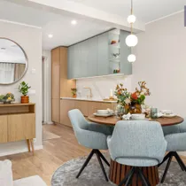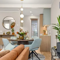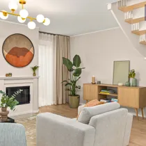 •Siseviimistlusega luuakse hubane kodu, kus on mahedad toonid ja kvaliteetsed materjalid. Kasutatud on naturaalset tammepuitparketti, keraamilisi plaate ja SWEDOOR'i mantelservaga massiivuksi. Sanitaartehnika firmadelt DURAVIT ja HANSGROHE.