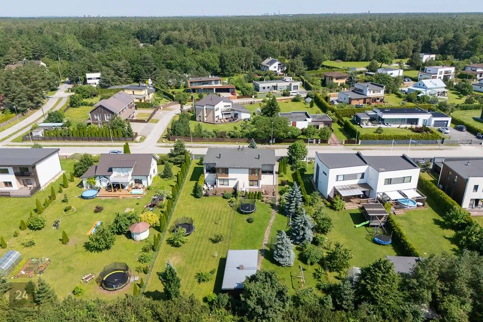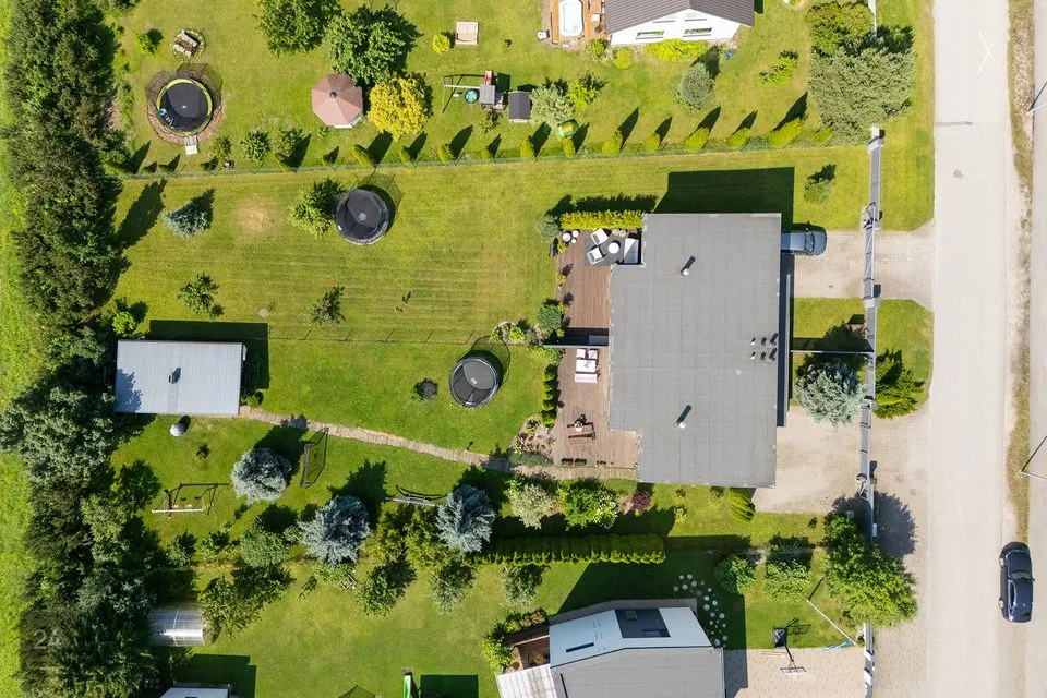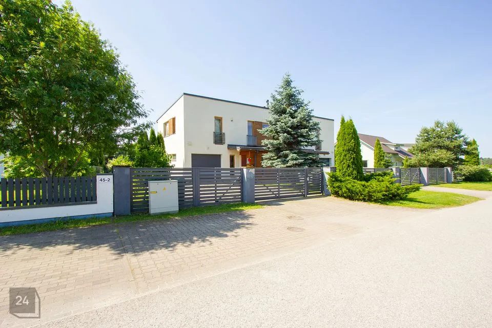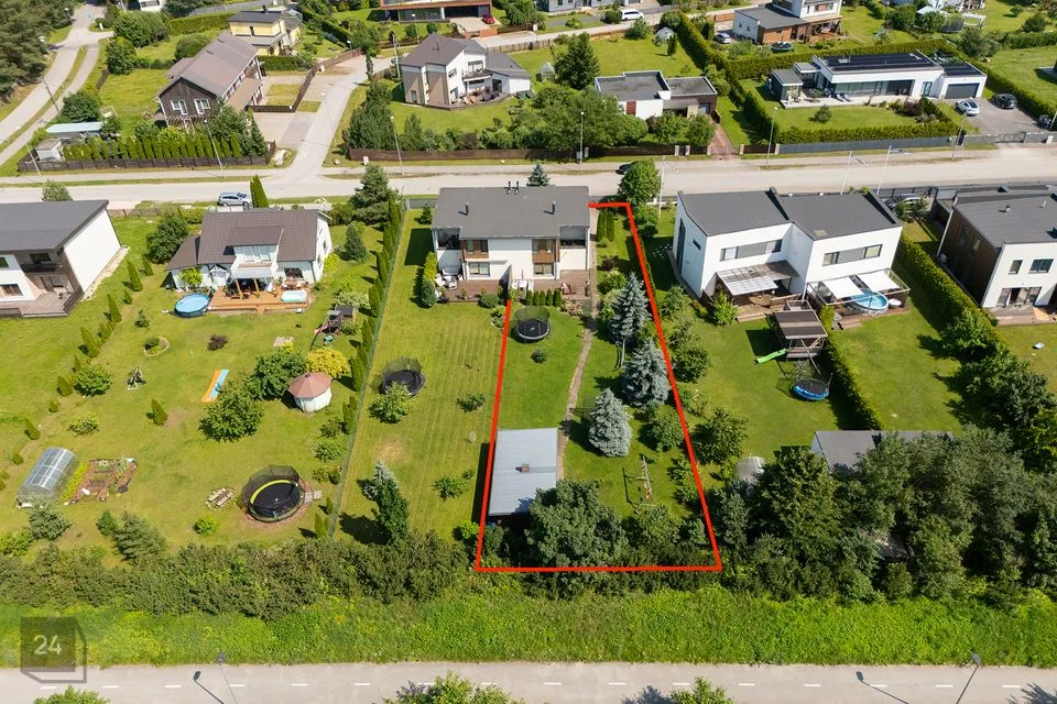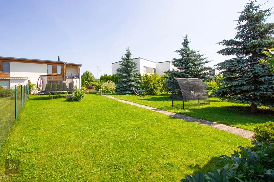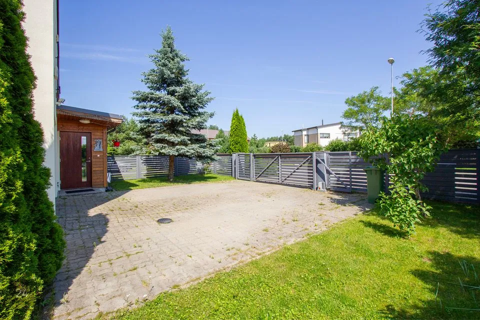 Kinnistu ümber ja hoovialade vahel on piirdeaed. Maja ees on betoonkividest parkimisala. Autovärav on avatav puldiga ning telefoniga. Maja ees on ka elektriauto laadija. Notariaalse kasutuskorraga on määratud kummagi majaosa kasutuses olevad alad. Müüdava kodu juurde kuulub suurem, koos majaaluse pinnaga 881 m2 suurune ala.
