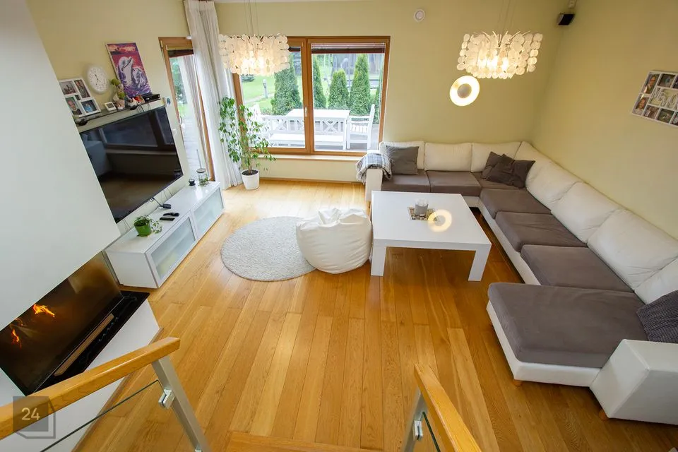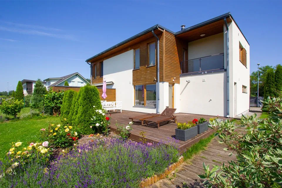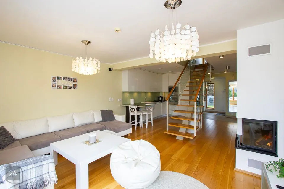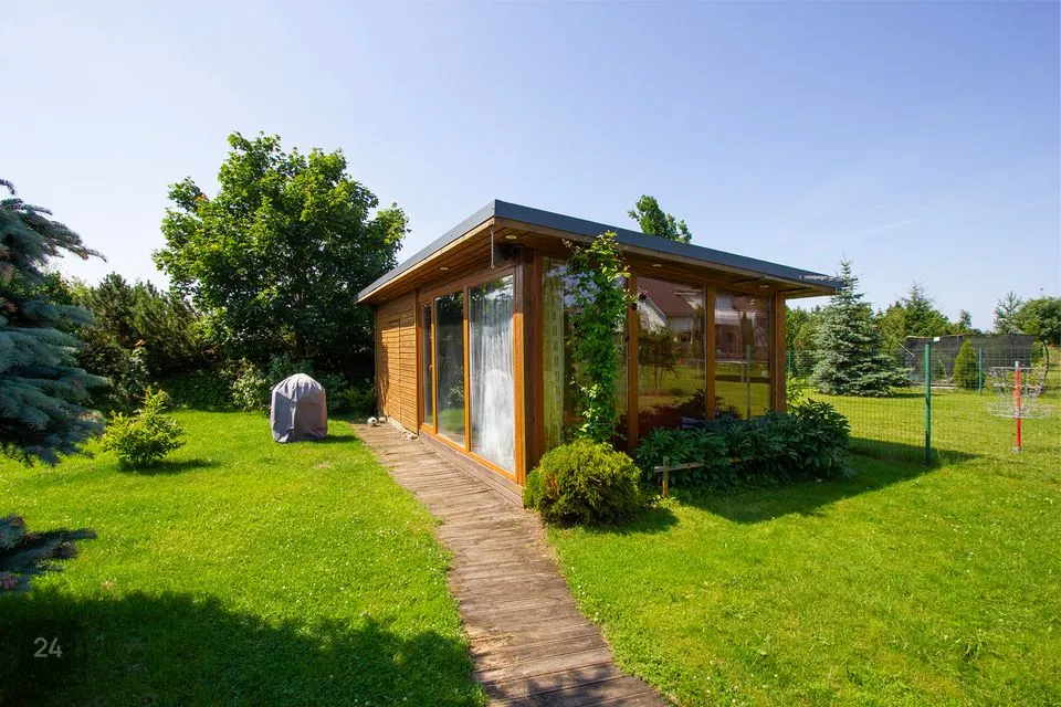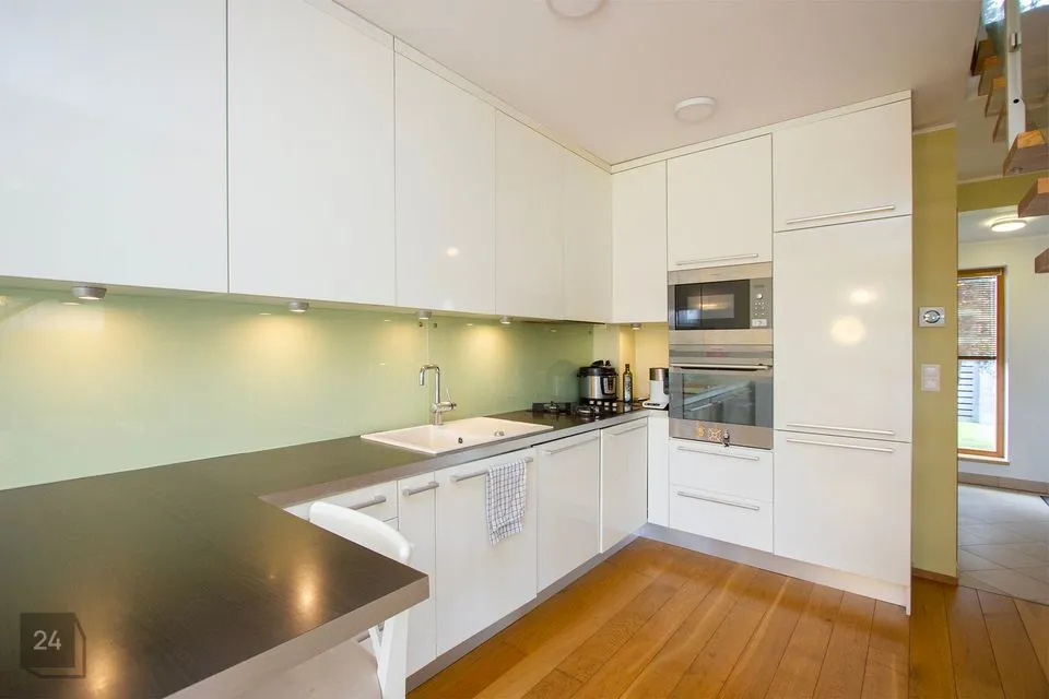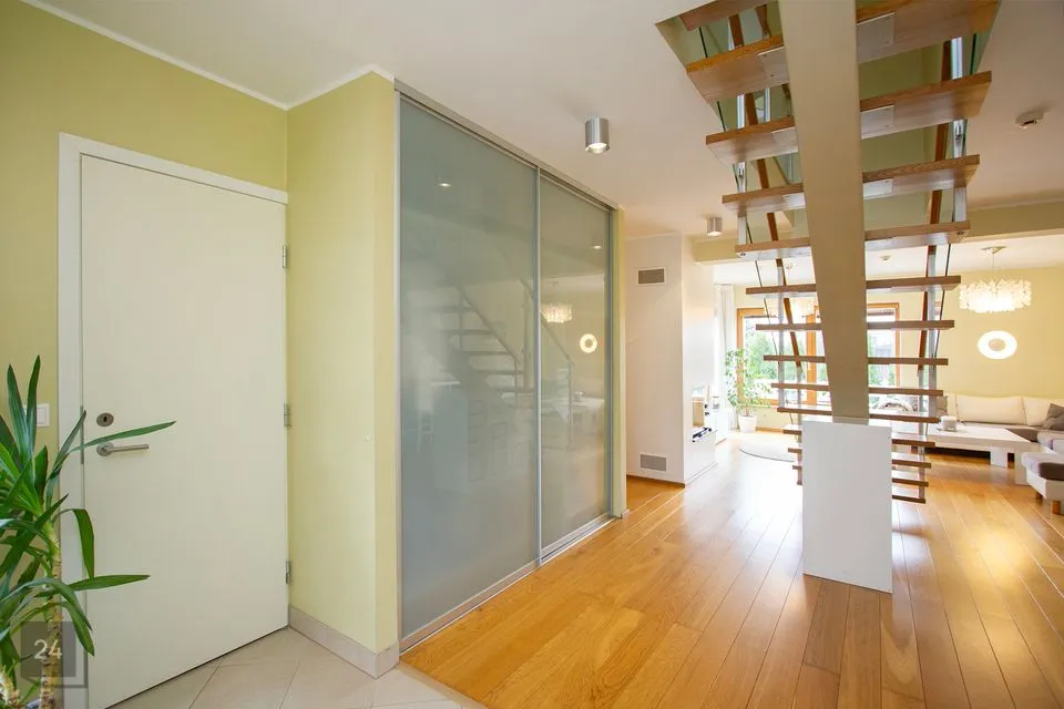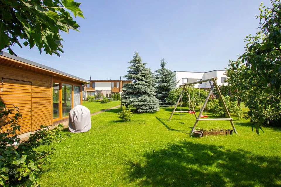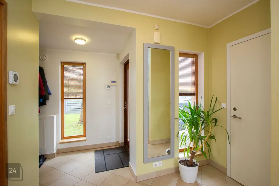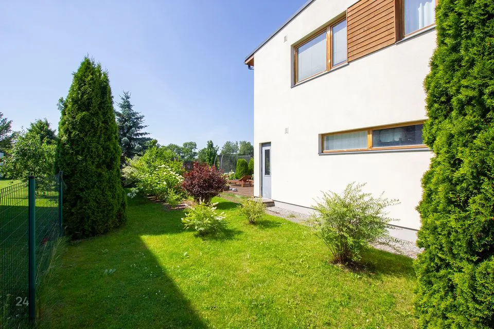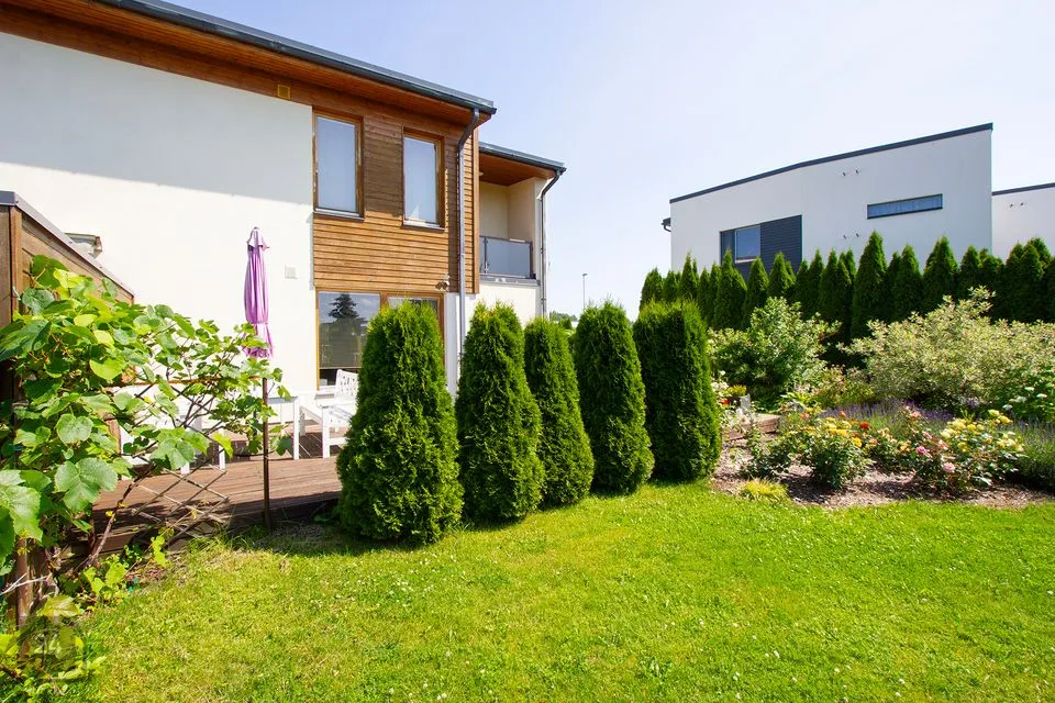 Hoone on mahult jagatud kaheks, kuid tänu korralikele vaheseintele eluruumides naabreid praktiliselt kuulda pole. Hoone on paigutatud krundile selliselt, et jääks võimalikult palju haljasala pinda ning puitterrass jääb majast sisehoovi ning päikese poole. Fassaadis on kasutatud beeži krohvi ning pruuni puitlaudist. Majal on puitraamidel pakettaknad. Põrandatel on puitparkett. Niisked ruumid ja esik on plaaditud. Hoovi tagaservas asuv kõrvalhoone koosneb kahest osast. Lisaks fotodel kajastatud kaminaga ruumile on eraldi sissepääsuga ka puukuur.