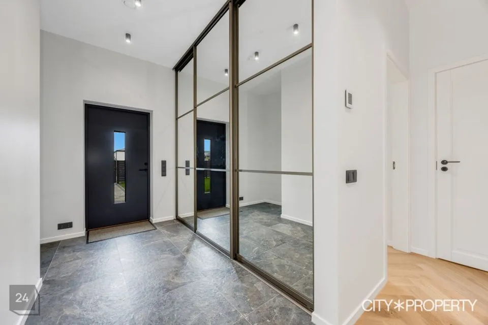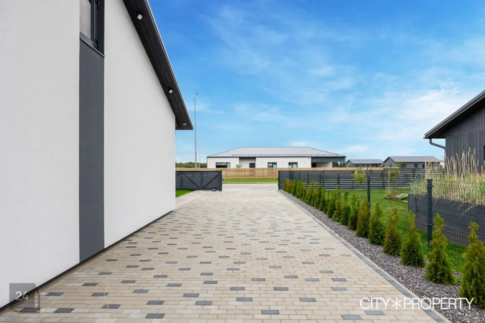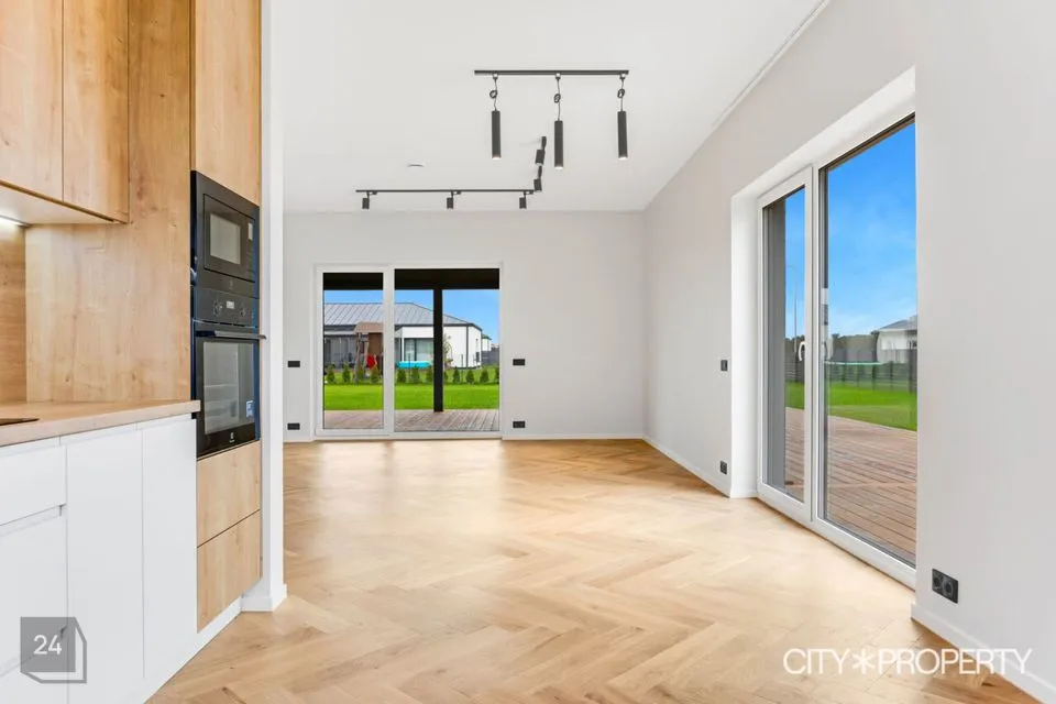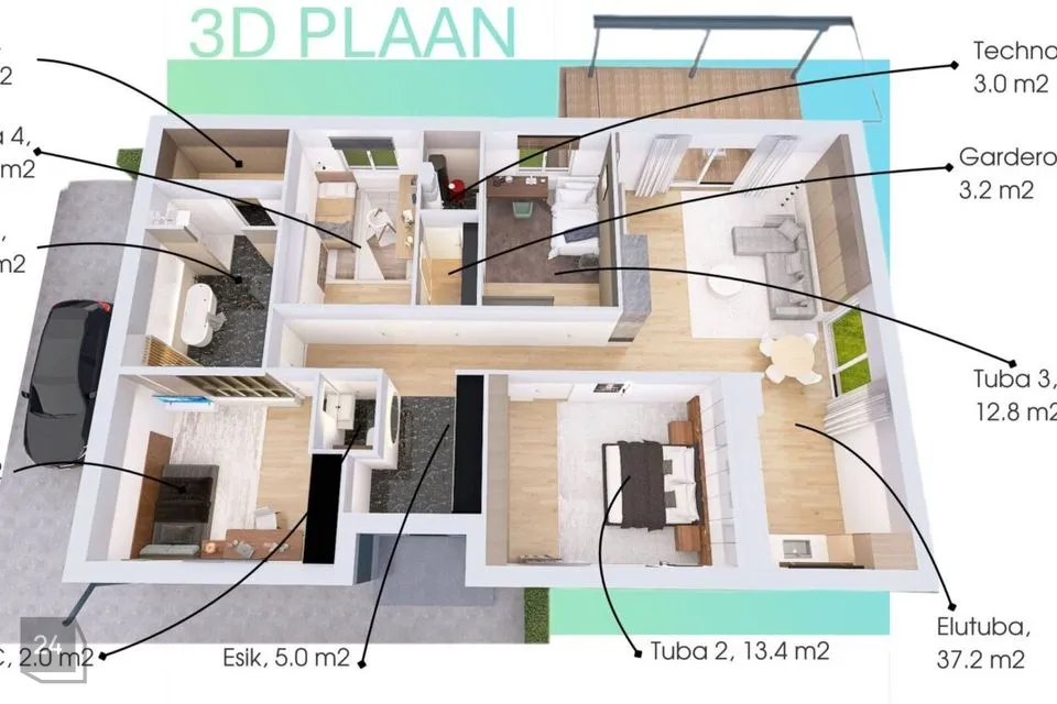 Müügile on tulnud eramu omadustega majaosa, maja koosseisu kuuluvad avatud köök-söögituba ja elutuba (37.2 m²), neli magamistuba (13.8m², 13.4m², 12.8m² ja 12.8m²), vannituba/tualett/saun (15.8m²), eraldi tualett (2m²), walk-in garderoob (3.2m2), tehnoruum (3m²), esik (5m²) ja koridor (10m²). Elutoast pääs, varjualusega, päikesepoolsele terrassile (24m²) kus suvel mõnus pere või sõpradega aega veeta, lisaks kuulub maja juurde autovarjualune (26m²).