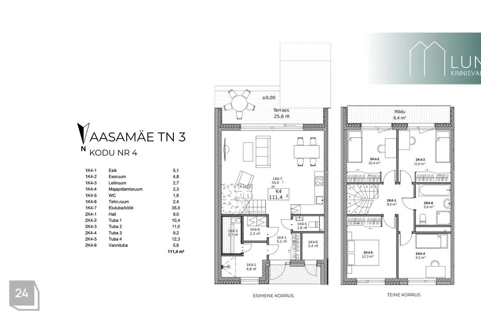 Esimese korruse keskmes asub avar ja hubane köök-elutuba 35,0 m², mille maast laeni ulatuvad aknad avanevad maksimaalse privaatsusega lõunapoolsele 25,6 m² terrassile. Nutikalt planeeritud köögiosa lisab veelgi funktsionaalsust. Koridori osa ühendab majapidamisruum 2,3 m², eraldi WC ruum 1,6 m², ruumikas ja hästi korraldatud eesruum 4,8 m². Koduse heaolu tõstab järgmisele tasemele privaatne leiliruum 2,7 m²– ideaalne koht lõõgastumiseks pärast pikka päeva. Olemas on ka eraldi sissepääsuga tehnoruum 2,4 m².