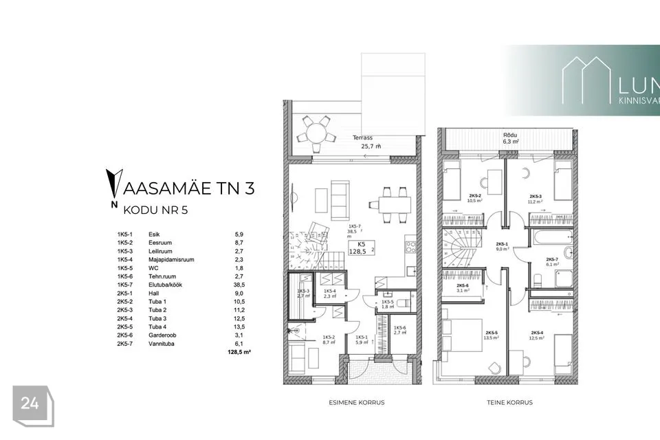 Esimese korruse keskmes on erakordselt avar ja valgusküllane 38,5 m² köök-elutuba, mille suurus loob tunde, nagu oleksid eramajas. Elutoast avanevad maast laeni aknad otse lõunapoolsele 25,7 m² terrassile, kuhu päike ulatub terve päeva. Nutikalt planeeritud köögiosa lisab veelgi funktsionaalsust. Koridoriosa ühendab omavahel majapidamisruumi 2,3 m², eraldi WC ruumi 1,8 m² ning ruumika ja hästi korraldatud eesruumi 8,7 m². Koduse heaolu tõstab järgmisele tasemele privaatne 2,7 m² leiliruum – ideaalne koht lõõgastumiseks pärast pikka päeva. Olemas on ka eraldi sissepääsuga tehnoruum 2,7 m².
