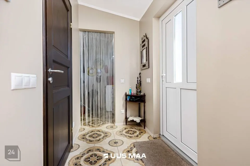Majja sisenedes astud esmalt esikusse, kuhu saab jätta nii jalatsid kui üleriided. Edasi minnes satud mõnusasse valgesse elutuppa ja sealt omakorda kööki, kus on kõik vajalik olemas: köögimööbel koos tehnikaga ning isegi puuküttega pliit – selle kodu süda, kust liigub soojus kõikidesse tubadesse laiali, luues nii hubase kodu tunde.