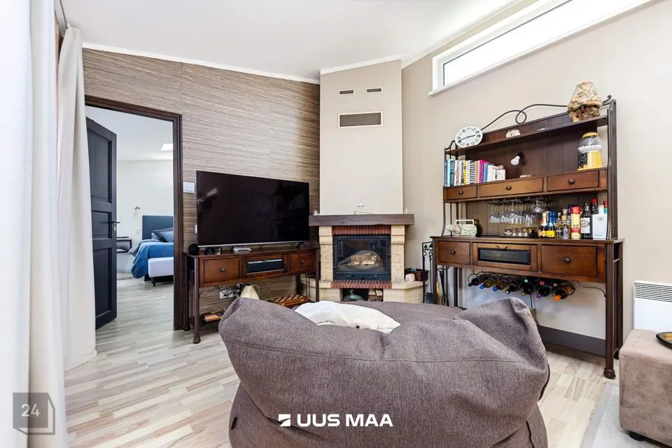 Esikust edasi minnes satud avarasse avatud köögiga elutuppa, kus on kamin, mis annab omakorda mõnusat soojust ja hubasust. Elutoast vasakule liikudes leiad magamistoa, kus on olemas ka garderoob. Efektse valguslahendusena on mõlemas toas katuseaknad.