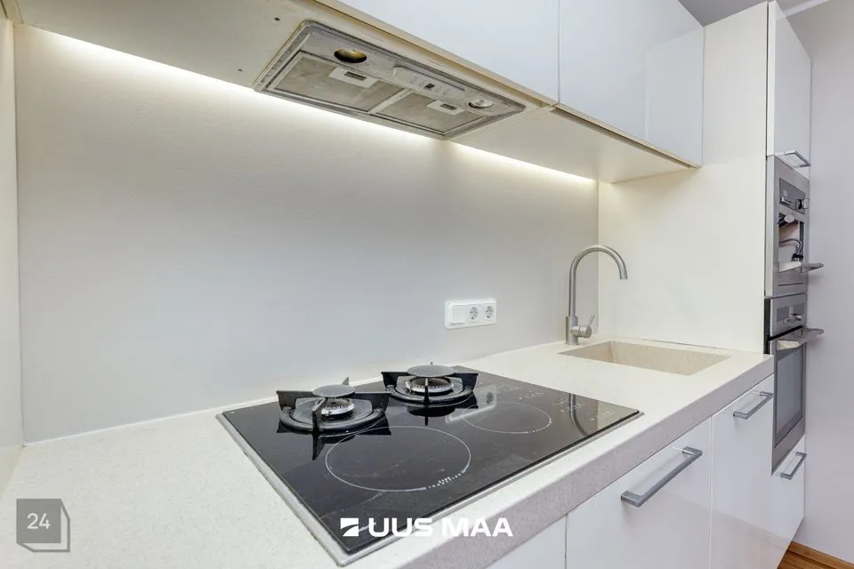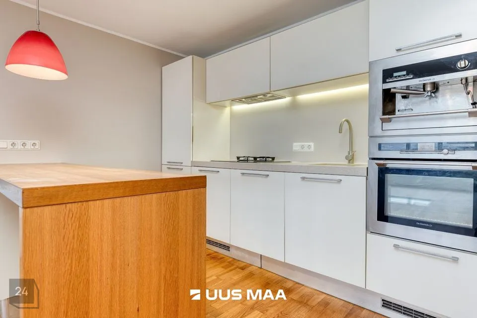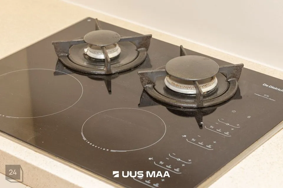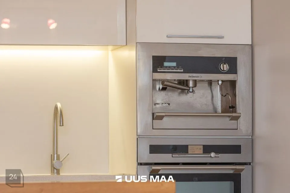 Köögis on Aet Piel kujundatud köögimööbel DeDietrich integreeritava tehnikaga (induktsioon-gaas pliidiplaat, ahi, kohvimasin), õhupuhastaja, nõudepesumasin, sügavkülmikuga jahekapp.