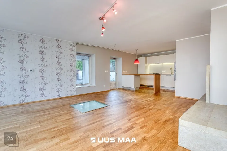 Elutoa põrandat katab naturaalne parkett ja põrandas on 1 x 1 meetrise pakettklaasiga kaetud dekoratiivset eesmärki kandev valgustatud süvend.