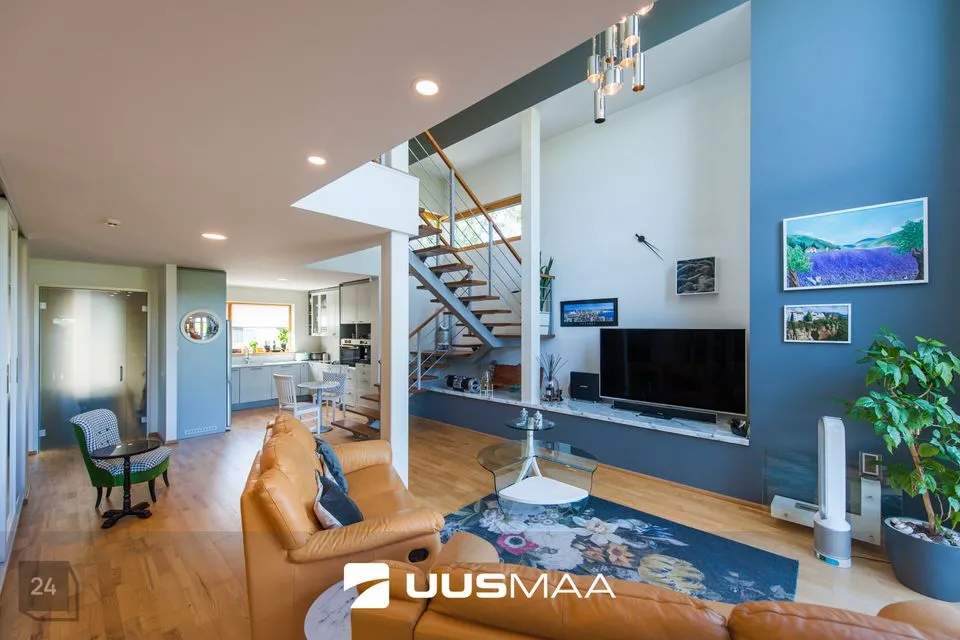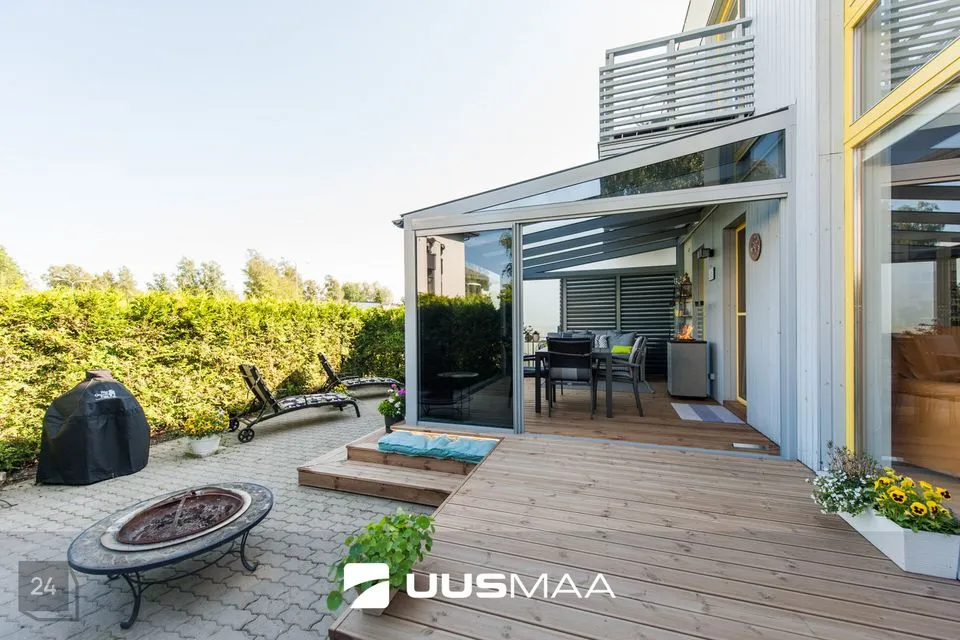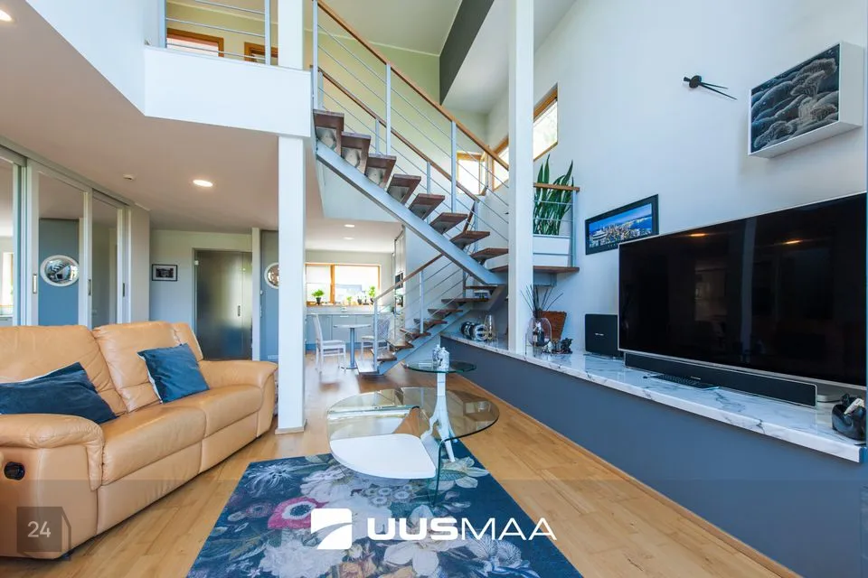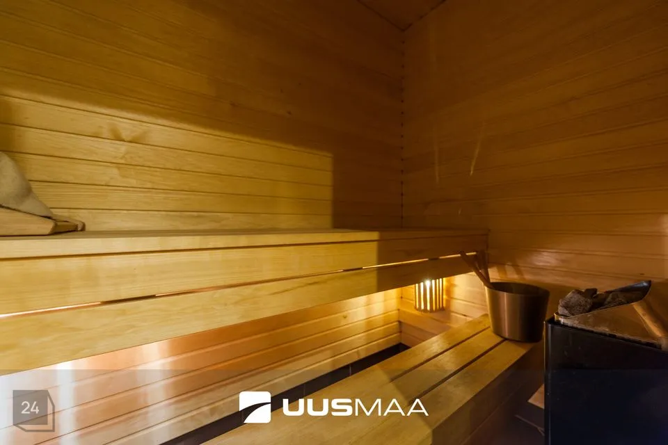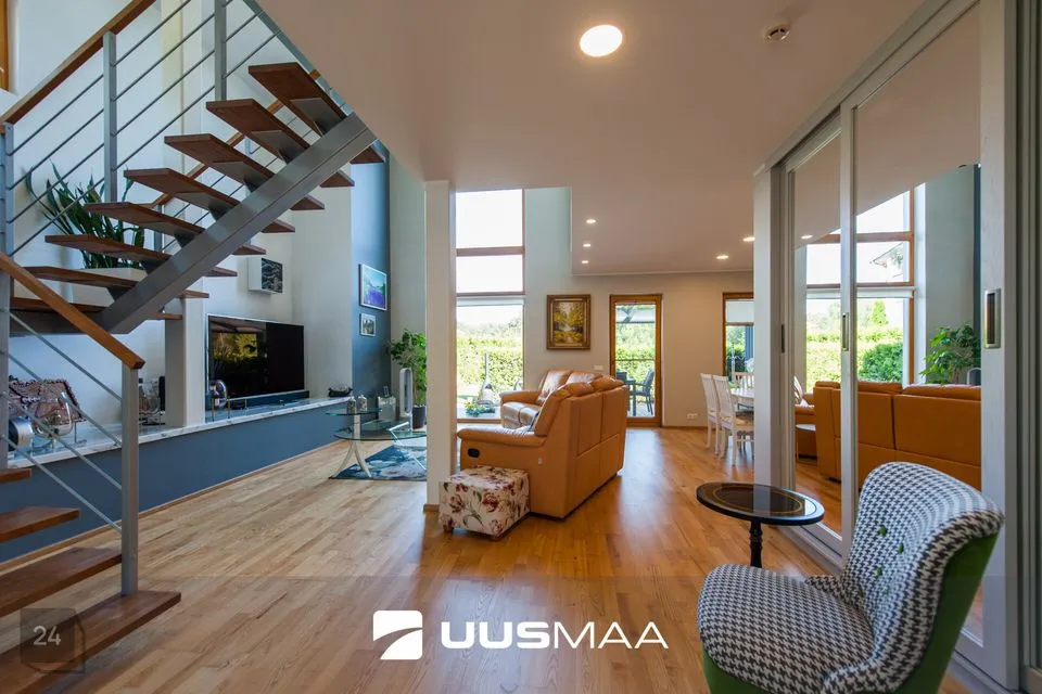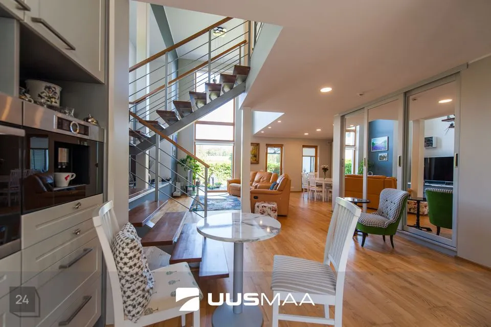 Esimesel korrusel avatud köök, suur elutuba kaminaga, saun, WC ja klaasitud suur terrass ka kaminaga.