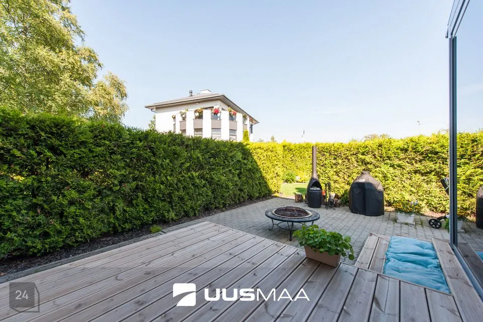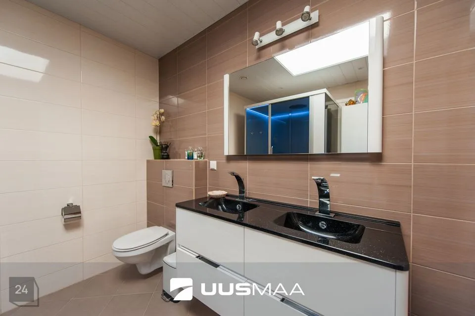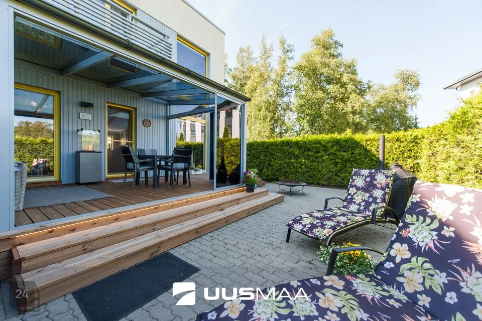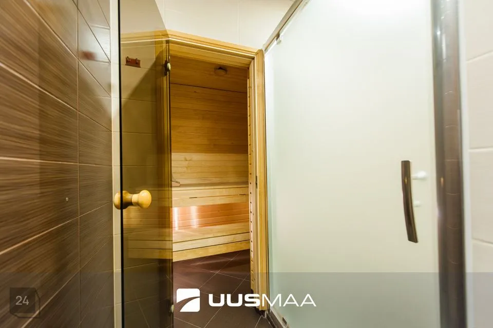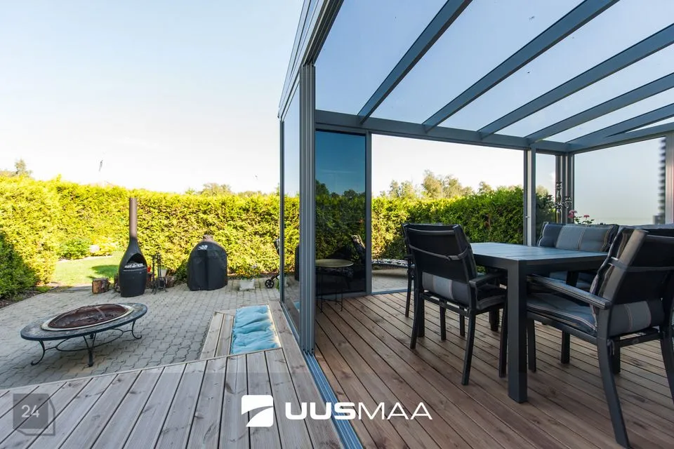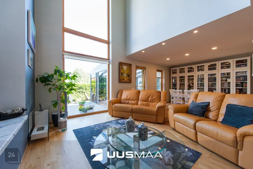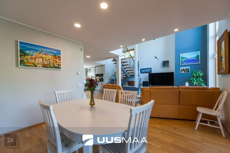 Esimesel korrusel avatud köök, suur elutuba kaminaga, saun, WC ja klaasitud suur terrass ka kaminaga.