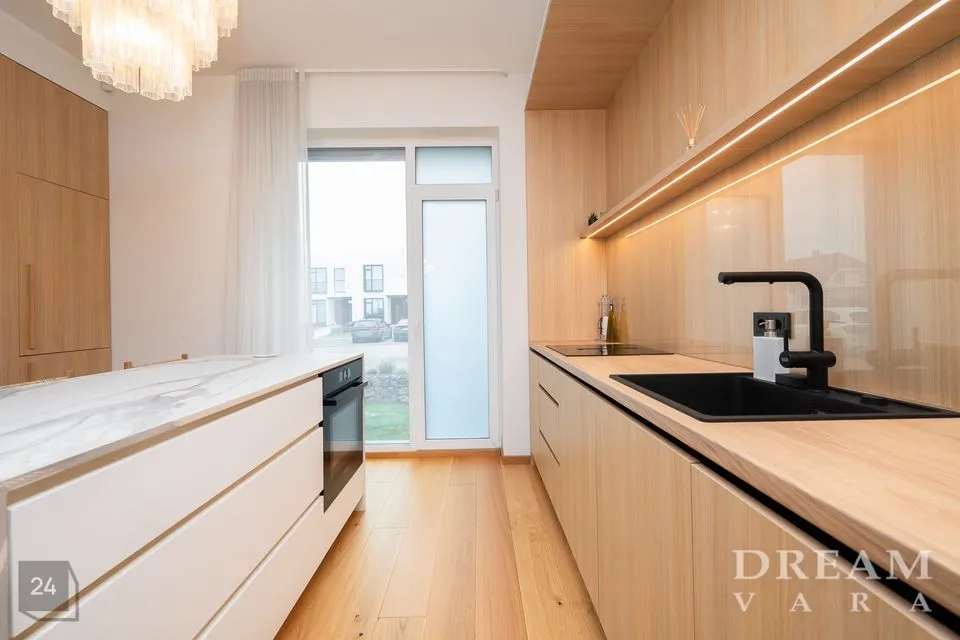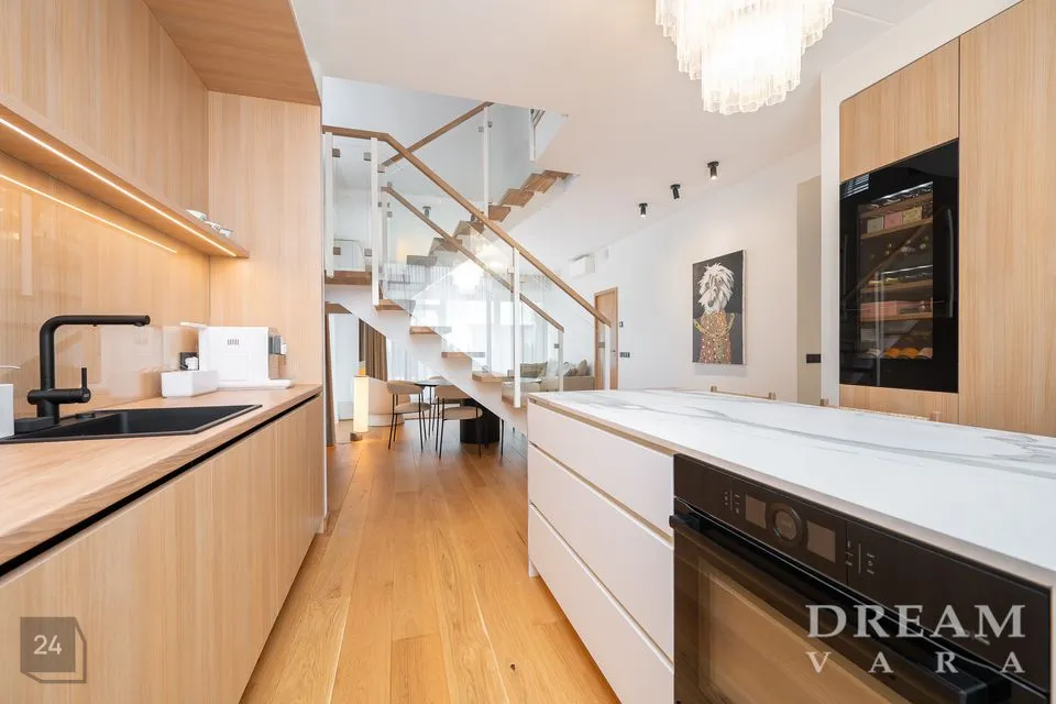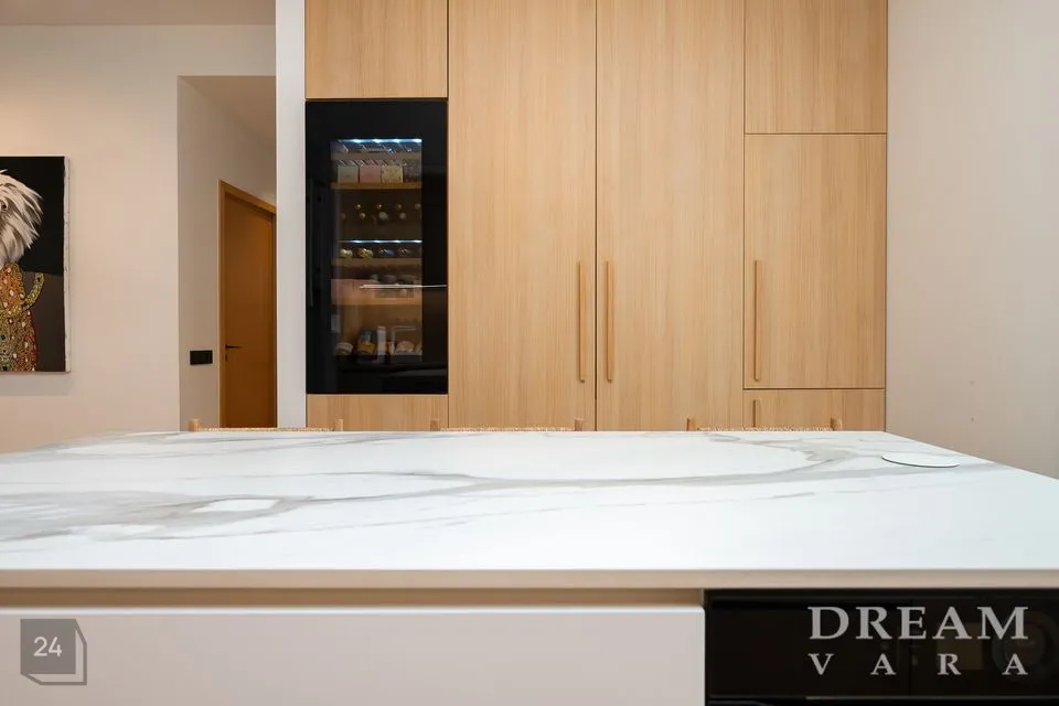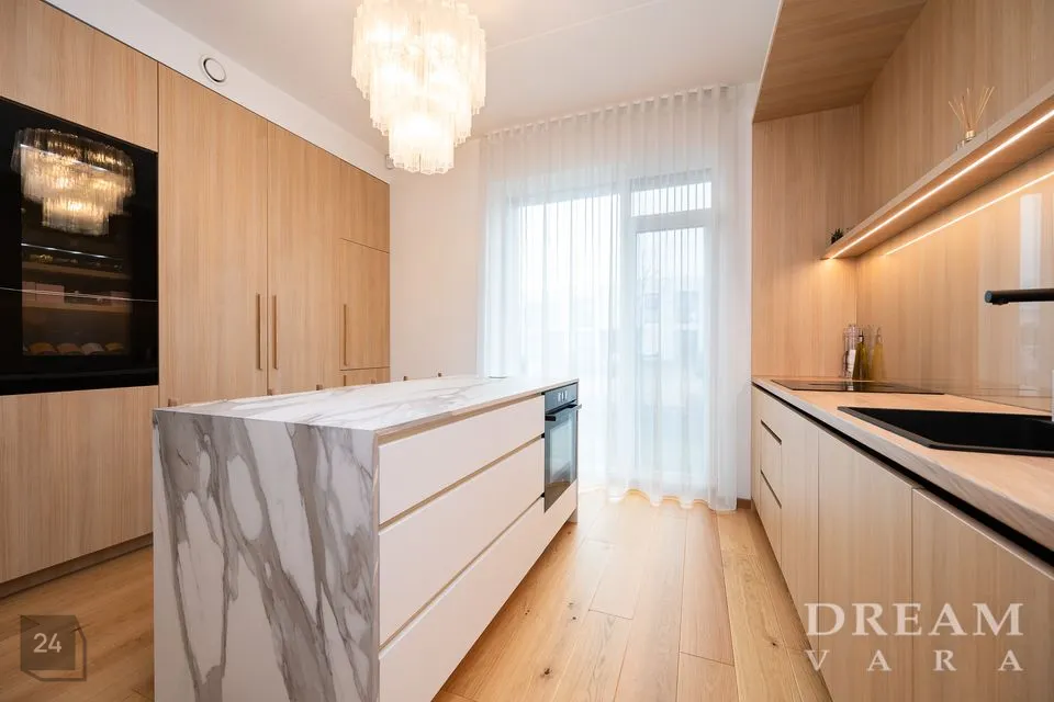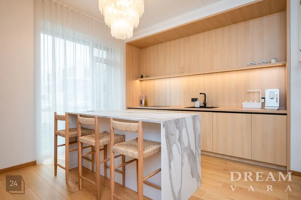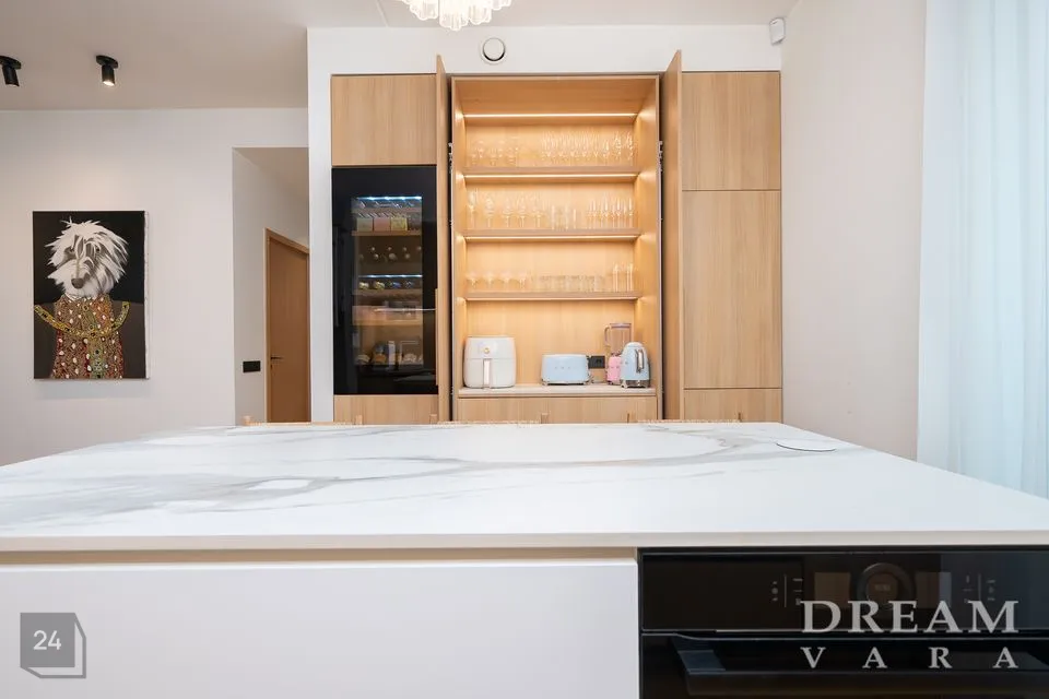Köögimööbel sisaldab Boshi mikrolainefunktsiooniga isepuhastuvat praeahju (appiga juhitav), õhupuhastiga induktsioonpliiti, nõudepesumasinat ning sisseehitatud veinikülmikut (tellitud otse Itaaliast). Köögis kapiuste taha võimalik silma alt ära panna köögitarvikud. Köögimööbel puidu tooni, kivist töötasapinnad ja sahtlitega köögisaar koos istumisalaga.