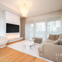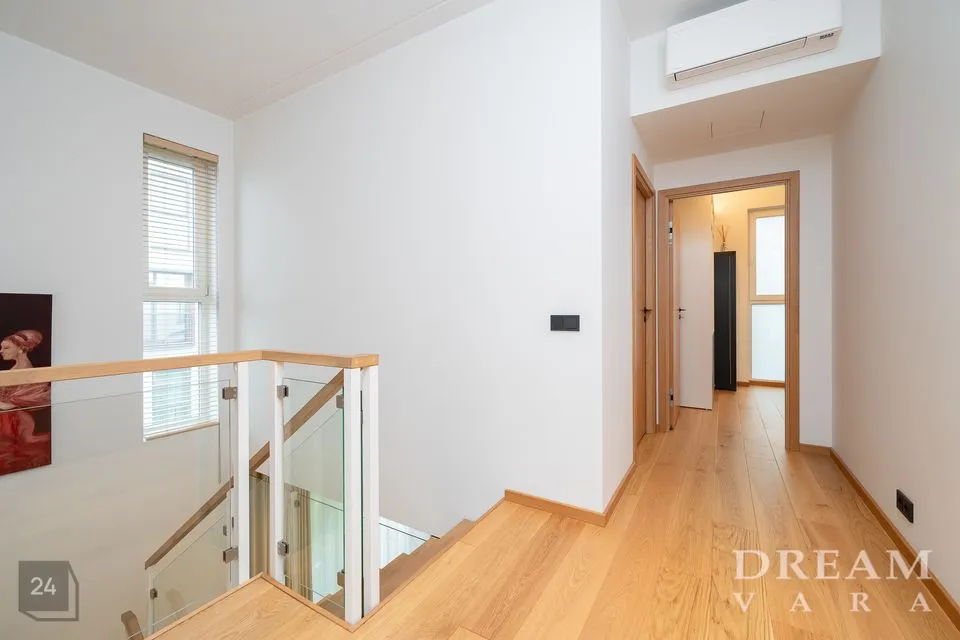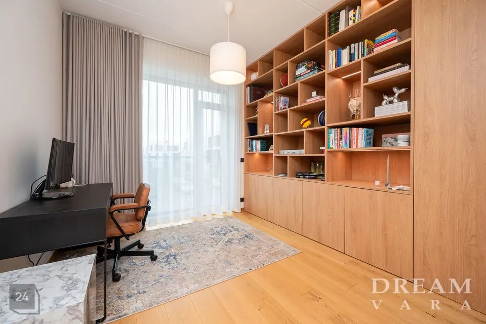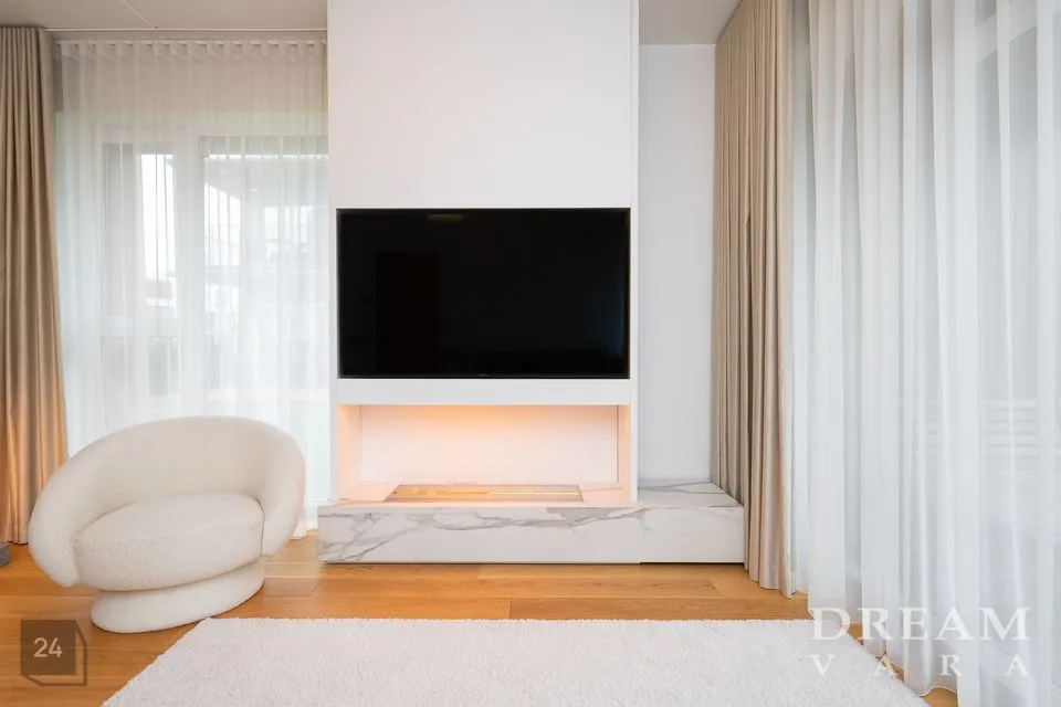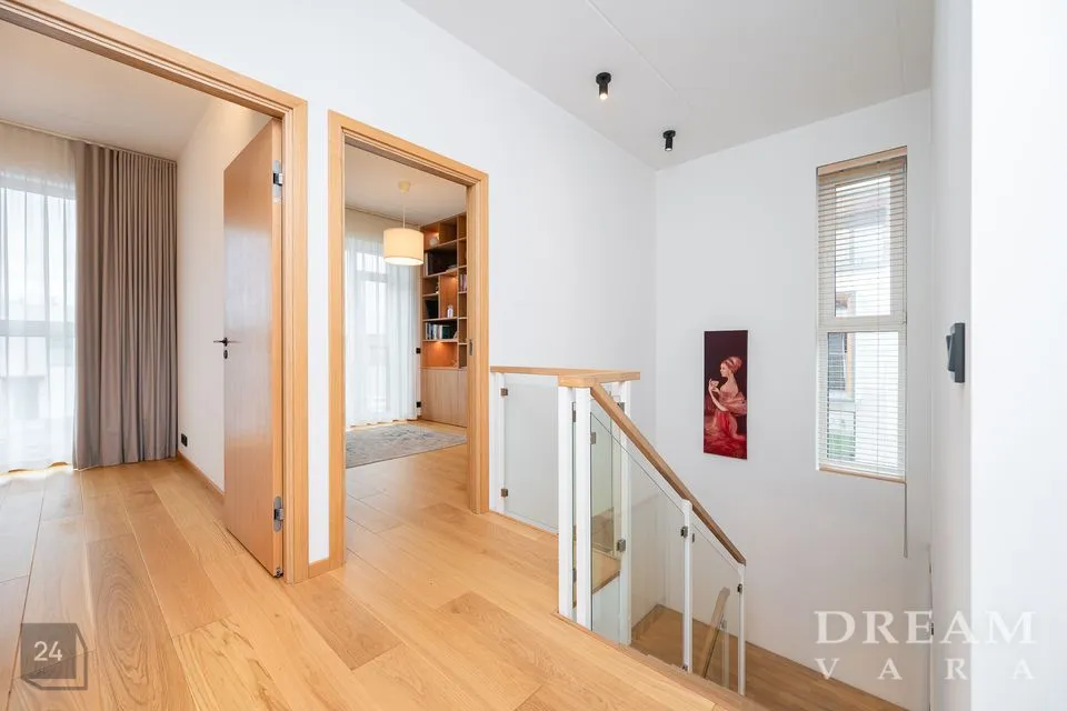 Kõik kolmikvillas olevad kardinad on valminud eritellimusel. Privaatsust lisavad puldiga juhitavad nutiklaasid köögi ja garderoobi akendel. Kodu on ühendatud valvesüsteemiga.