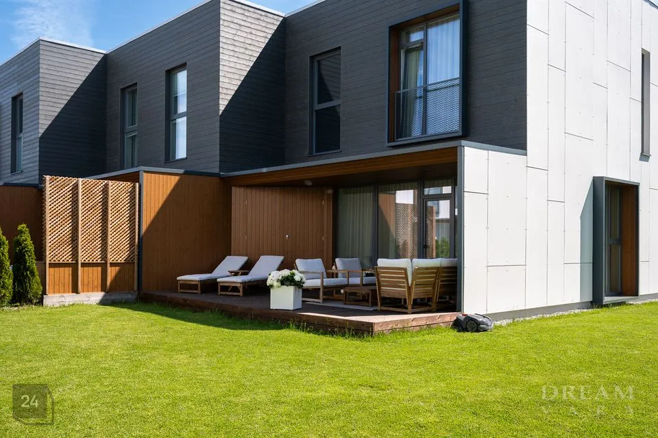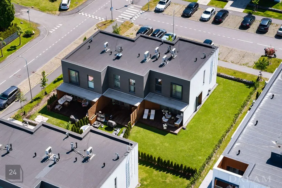 Kolmikmaja asub eemal suurtest teedest vaikses sisekvartalis. Majaosa planeering on läbi kahe korruse. Väga hea ruumilahendus, mis vastab ka nõudlikumale maitsele. 1. korrusel paikneb avar ja valgusküllane elutuba koos köögiga, saunaga vannituba, liaks esik ja tehnoruum/panipaik. Teisele korrusele viiv trepp jaotab 1. korruse kaheks tsooniks - köögiks ja elutoaks. Elutoast pääseb terrassile (olemas ka kuur) ja aeda. 2. korrusel asuvad magamistuba, garderoobituba, kabinet, lastetuba (saab magamistubadeks teha ehk kokku 4 magamistuba), vannituba koos wc-ga ja trepihall.