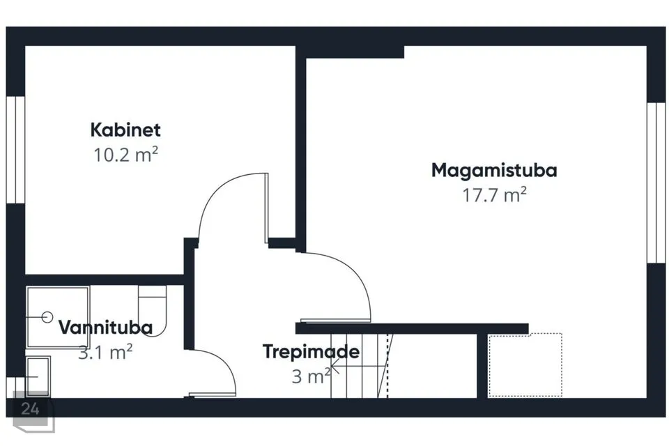 Elutoast viib trepp teisele korrusele. Teisel korrusel on väike trepihall, kaks eraldi magamistuba ja vannituba. Suurema magamistoa aknad jäävad hommikupäikselisse sisehoovi. Magamistoas on garderoobinurgake, kuhu on mugav kõik tarvilik hoiustada. Teine, väiksem magamistuba jääb õhtupäikese poole. Teisel korrusel asub ka suurem dušinurga ja WC-ga vannituba.